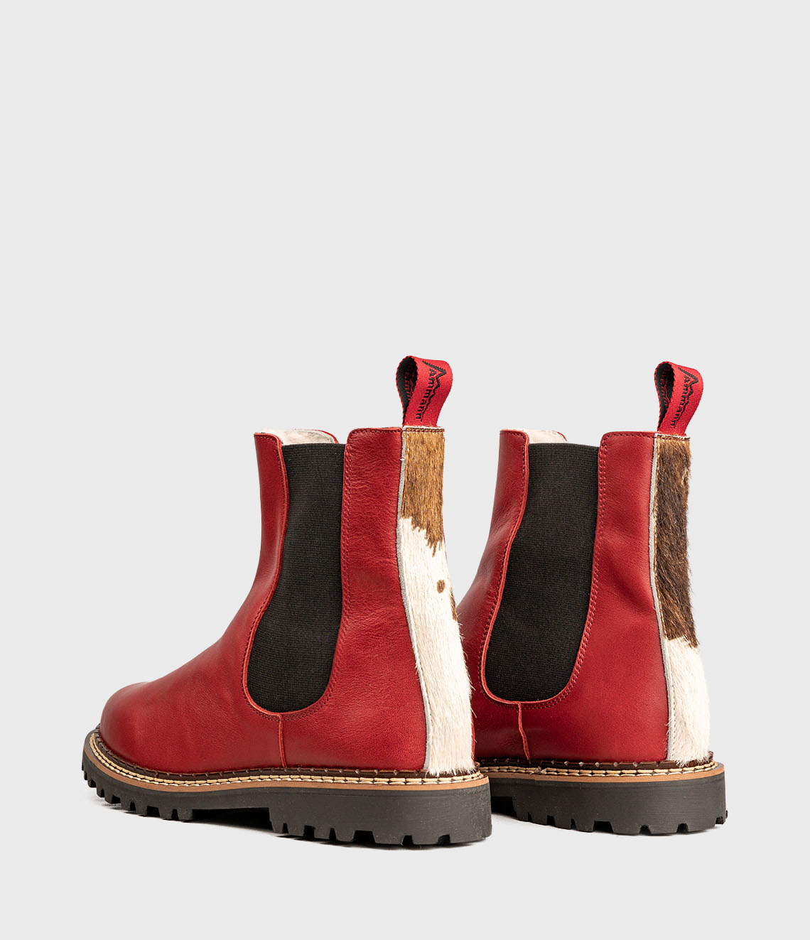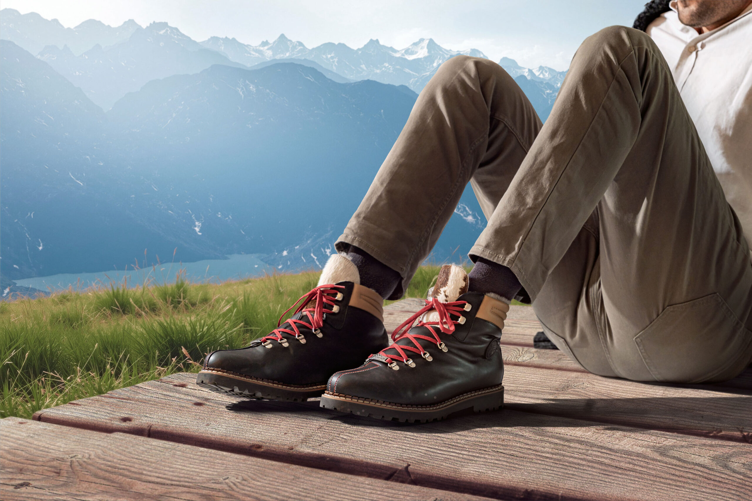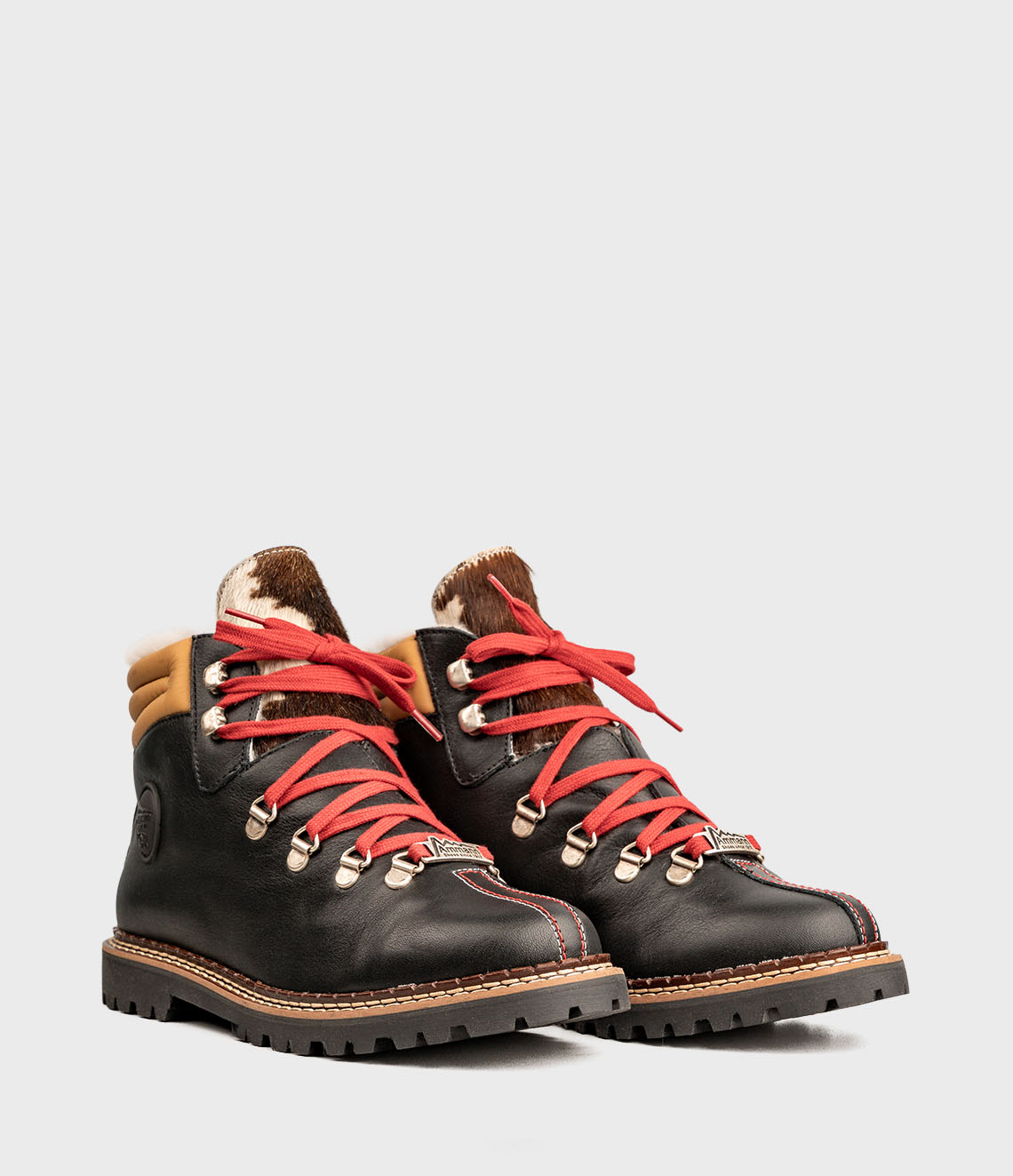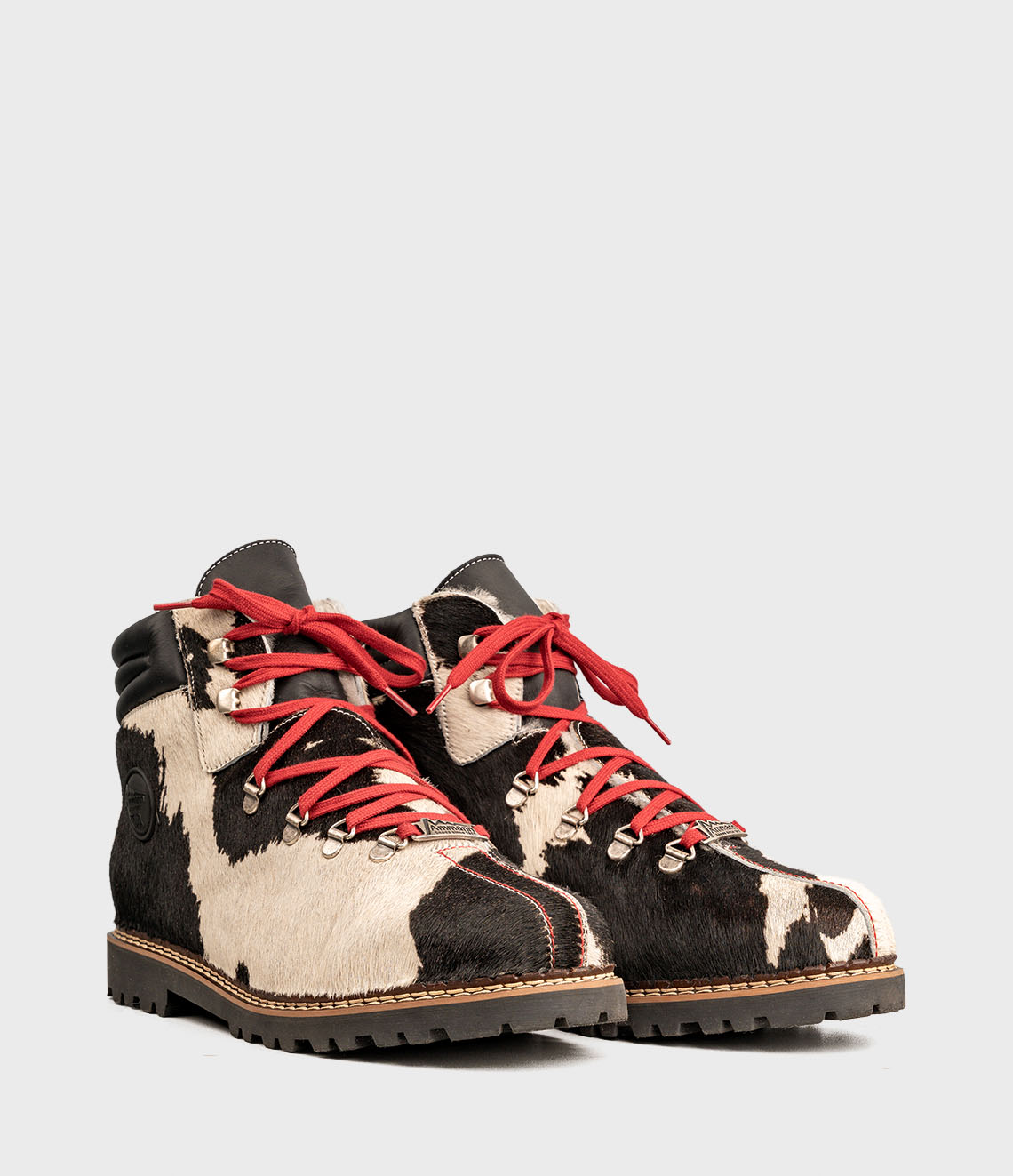 Der ikonische Town-Boot bildet das Herz dieser Geschichte. Ein Fellboot, der die alpine Herkunft in unverkennbarer Klarheit trägt, und gleichzeitig so urban wirkt, dass er auf jeder Piazza, jedem Kunstquartier, jeder verschneiten Hotelterrasse funktioniert. Ob in Kuhfell, tiefem Schwarz, vibrierendem Rot oder ruhigem Ecru – der Town ist kein Fashion-Piece, sondern eine Haltung. Eine, die sich ohne Worte ausdrückt, weil Material, Form und Handwerk genug sagen.