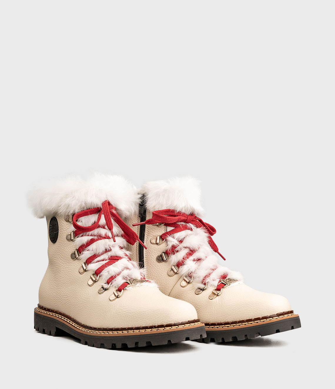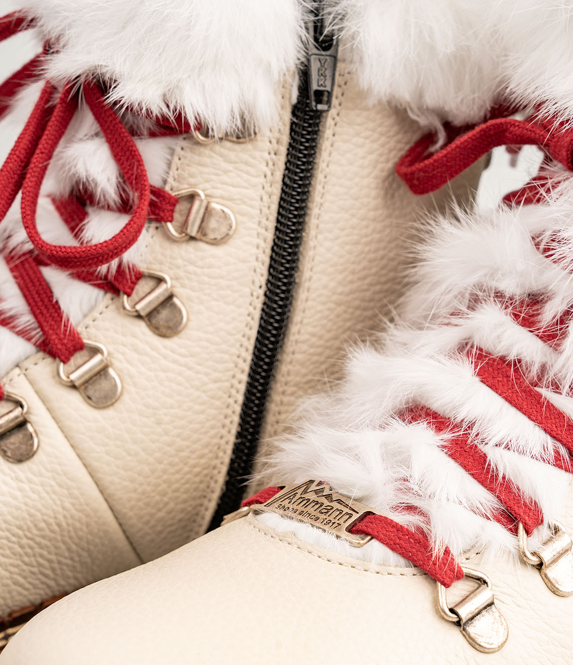 Der Splügen-Boot, weich, warm, in Ecru-Leder oder Fell, wirkt dagegen wie die vertrauteste Geste der Kollektion. Ein Modell, das man morgens anzieht und abends nicht mehr ausziehen möchte. Verlässlich, harmonisch, leise. Ein Winterklassiker, modernisiert, aber nicht entfremdet. Und dann ist da Malix – der kleine Rebell unter den Modellen. Rot, Schwarz, Ecru oder Kuhfell. Ein Boot, der nicht laut rebelliert, sondern selbstbewusst seinen Platz behauptet. Für Frauen, die ihren Stil nicht überdenken, sondern leben.