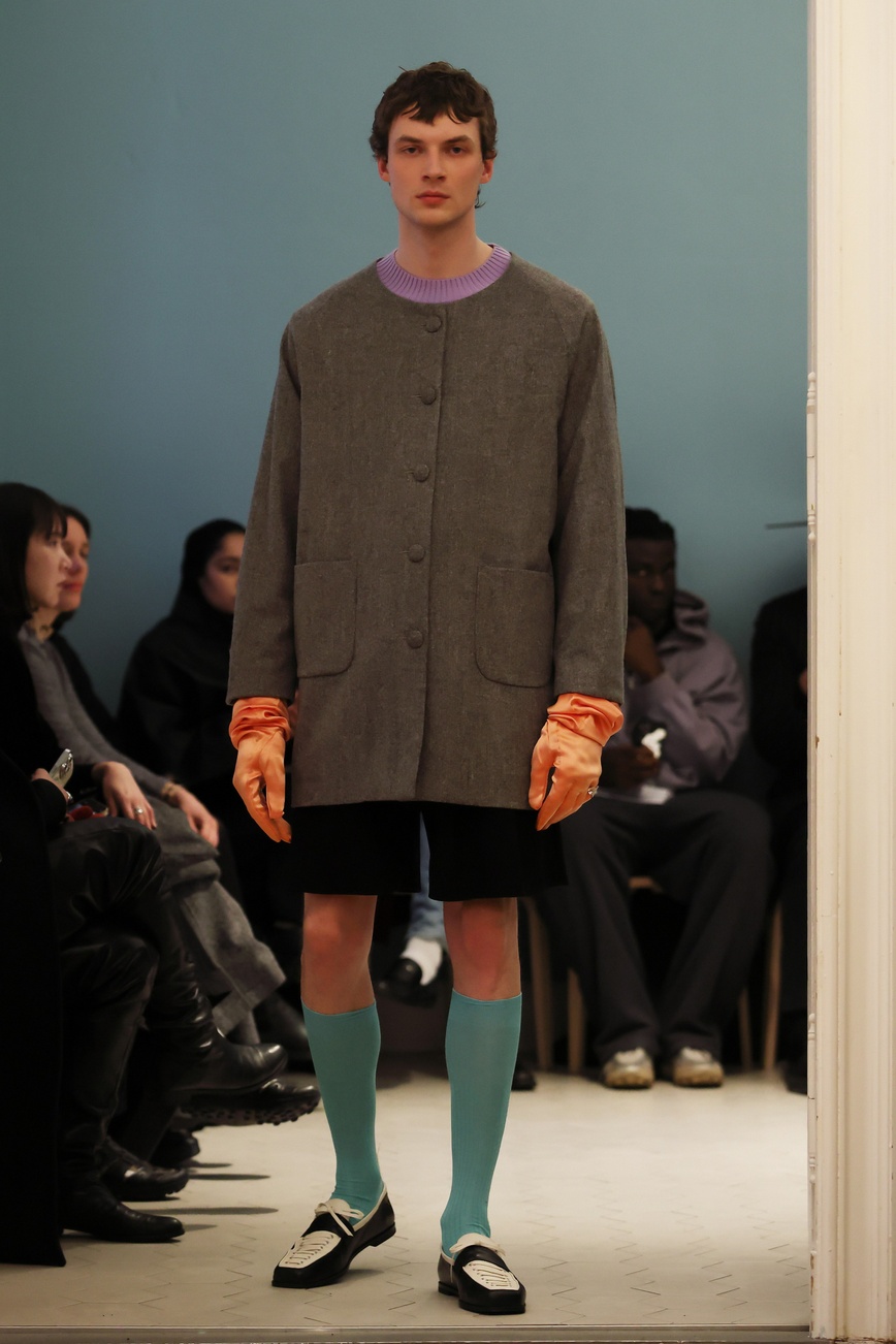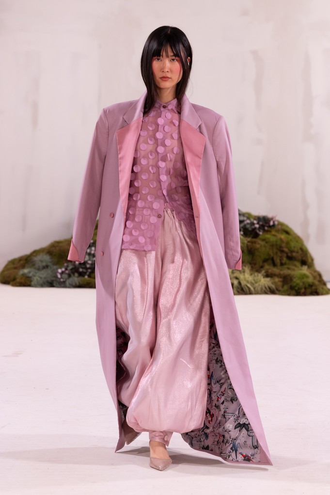 Wer sind wir, wenn niemand hinsieht? Diese Frage untersuchte die neue Kollektion von SF1OG, die sich mit der Spannung zwischen dem Verborgenen und dem Sichtbaren auseinandersetze. In einem Setting angelehnt an ein Kaiserpanorama – ein Schaugeschäft, das um die Wende zum 20. Jahrhundert populär wurde – präsentierte das Label eine vom viktorianischen Zeitalter inspirierte Modekollektion, etwa in den Jacken, die den Silhouetten viktorianischer Trauerkleider nachempfunden waren. Darüber hinaus spielte das Label mit Layering-Techniken, die den Körper mal freilegten, mal vollständig umhüllten.