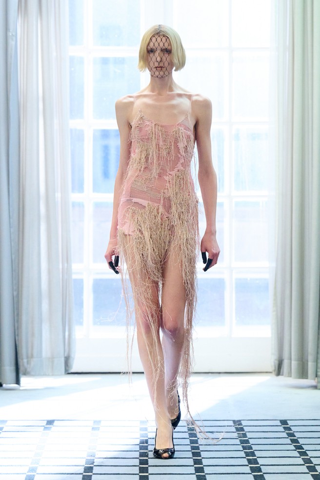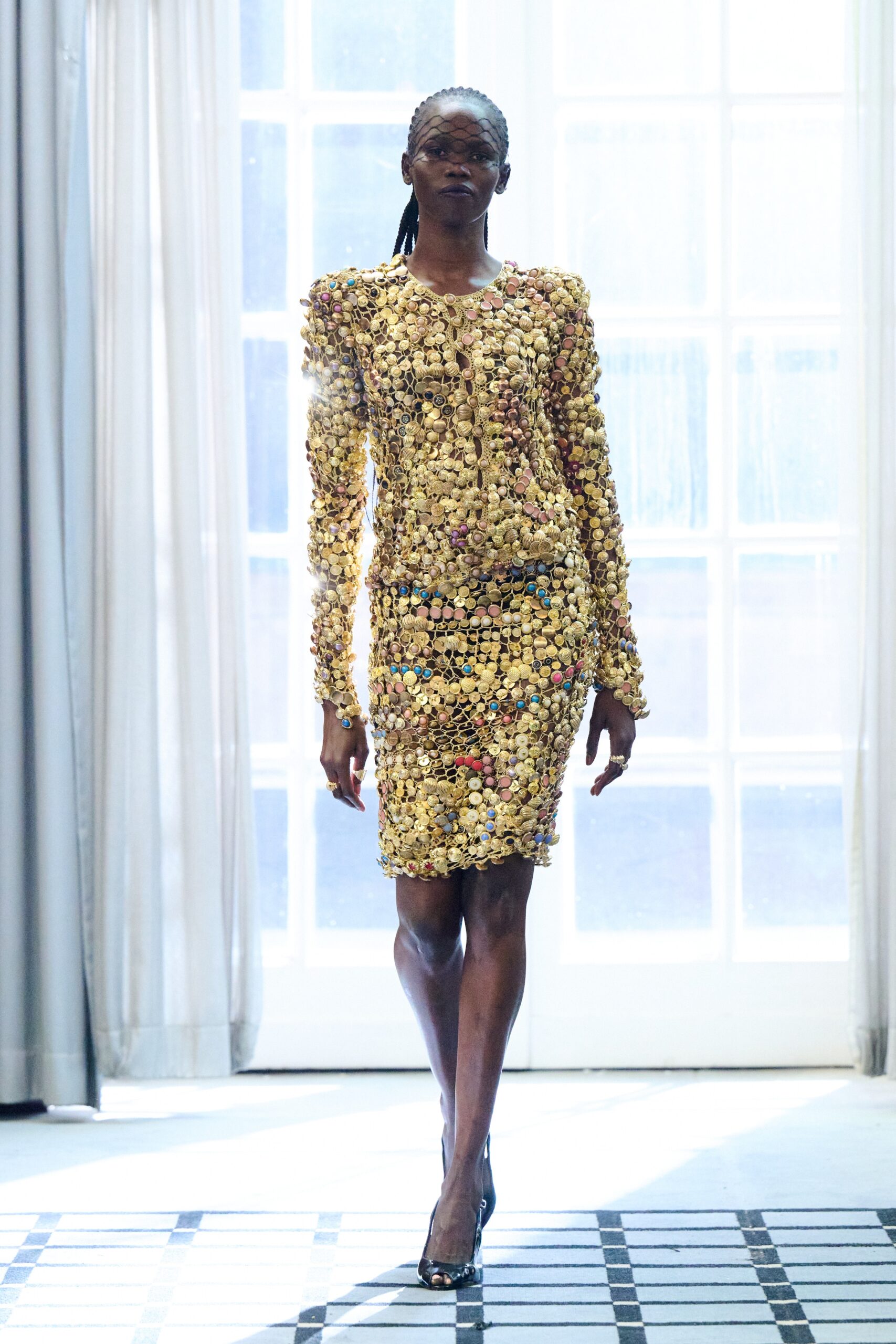 Als die Gäst:innen am Rathaus Schöneberg eintrafen, um die Show von Lou de Bètoly zu sehen, ging auf dem Vorplatz gerade der wöchentliche Flohmarkt zu Ende. Es sind Märkte wie diese, auf denen die Designerin die Stoffe und Materialien fand, aus denen in aufwendiger Dekonstruktion ihre Kollektion entstand: BHs und Tausende von Knöpfen gaben Kleidern, Oberteilen und Leggins ihre Form, Garnreste wurden zu dekorativen Fransen, und Vintage-Taschen verwandelten sich in Tops und Röcke. So stellte die Designerin nicht nur einmal mehr ihr Savoir-faire unter Beweis, sondern schloss auch den Kreis aus Handel und Handwerk, der ihre Arbeit entscheidend prägt.