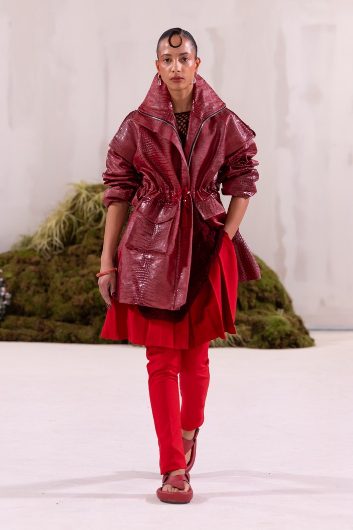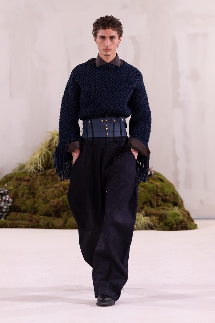 Die Kollektion „Backyards of Memory“ von Orange Culture ist als Fortsetzung der vorherigen zu verstehen, die der verstorbenen Mutter des Designers Adebayo Okelawal gewidmet war. In den aktuellen Designs verarbeitet der Designer Themen wie Nostalgie, Kindheit und Orte – etwa Hinterhöfe -, die uns über Jahre hinweg prägen. Der Fokus lag auf Handarbeit und besonderen Texturen, vor allem zu sehen in den zahlreichen Ton-in-Ton-Looks, Kleidern aus Makramée und Crochet, handgefärbten Stoffen, farbenfrohen Prints, Fransen-Sweatern, von Hand plissierten Schlaghosen sowie gewebten Accessoires.