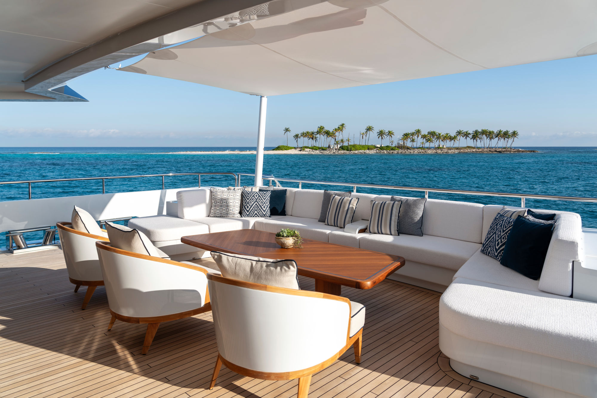 Beste Aussichten auf das endlose Blau von Himmel und Ozean bietet das großzügige, über 100 Quadratmeter große Sonnendeck. Unter einem Hardtop befinden sich eine Bar und ein großer Esstisch, zur Entspannung laden weiche Polsterflächen und ein Jacuzzi ein. Darunter hält die Achterterrasse des Brückendecks einen üppigen hölzernen Rundtisch für gesellige Runden bereit. Die Club Lounge auf dem Unterdeck erweist sich zudem als perfekter Spot, um gemeinsam Sonnenuntergänge zu genießen. Von hier aus führen zwei Treppen hinunter zur Badeplattform. Direkt damit verbunden ist das nach außen hin geöffnete Fitnessstudio, das exklusive Workouts mit Meerblick ermöglicht.