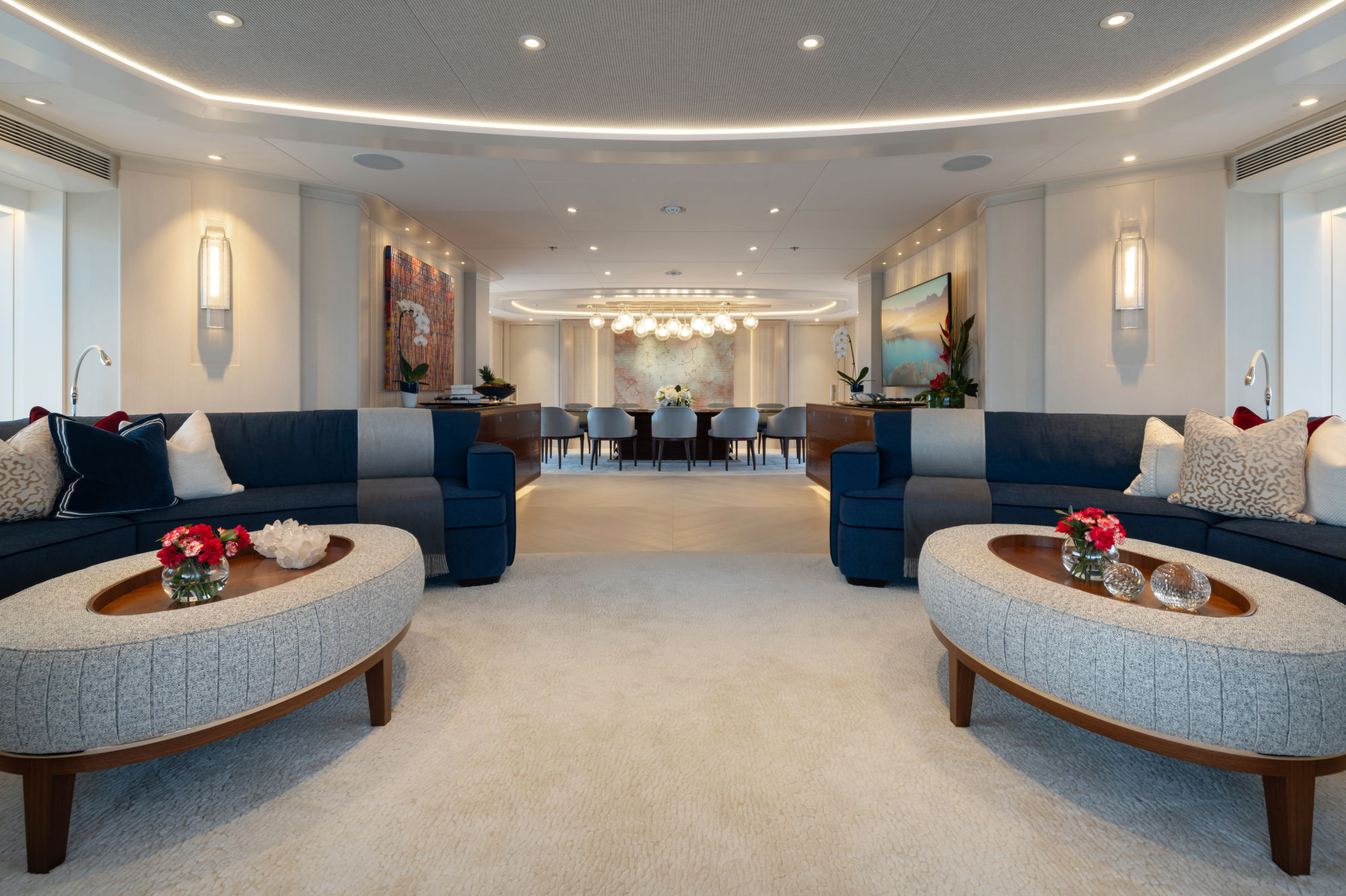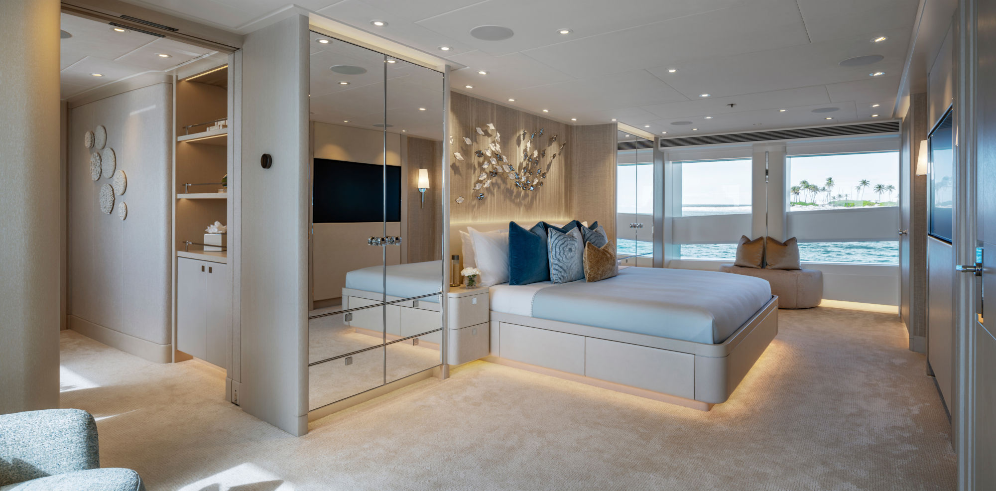 Die Innenräume der Santosha sind ebenso offen und licht gestaltet: Dunkle Hölzer treffen auf edles Leder, schimmernde Metallelemente auf cremefarbene Teppiche. Das vom britischen Studio Harrison Eidsgaard entworfene Interieur strahlt Modernität und Wärme zugleich aus. Als sozialer Mittelpunkt fungiert der Hauptsalon mit seinen maßgefertigten Möbeln und tiefblauen Sofas, wobei die hohen Fenster und breiten Glastüren die Grenzen zwischen Innen und Außen sanft verschwimmen lassen. Die Suiten und Kabinen im Bauch der Yacht bestechen dagegen durch ein helles, reduziert gehaltenes Dekor und weiche Teppichböden, gekonnt akzentuiert von sorgfältig ausgewählten Kunstwerken und zeitgenössischen Fotografien.