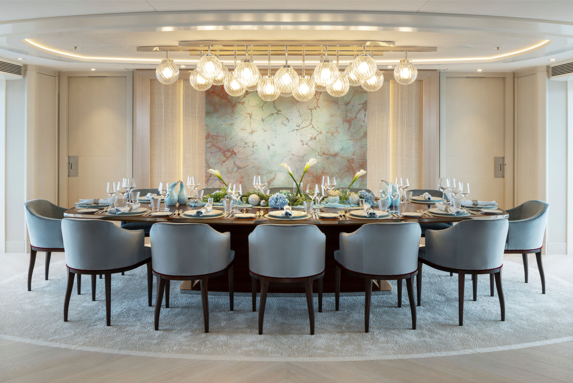 Zu den eindrucksvollsten Räumen der Santosha gehört das Hauptbad, das als Referenz an den biblischen Garten Eden konzipiert wurde. Eine weiße, mit Relieftechnik bearbeitete Marmortafel, gefertigt von den Londoner Künstlerinnen und Künstlern des DKT Studios, verleiht der Badarchitektur dabei ein kunstvolles Gepräge. Inmitten von Paradiesvögeln, Farnen und Trompetenblumen fällt besonders die Schlange ins Auge – ein Symbol, das für die Schiffseigner große persönliche Bedeutung aufweist. Am Waschtisch ist CYO in Chrom verbaut: Die markante Designarmatur von Dornbracht setzt hier einen subtilen Kontrast zum klassischen Look des Bads. CYO lässt sich aber auch in den Gästebädern finden: Mit ihrer charakteristisch geschwungenen Rundform trägt sie auf ihre ganz eigene Weise zum maritimen Ambiente bei.