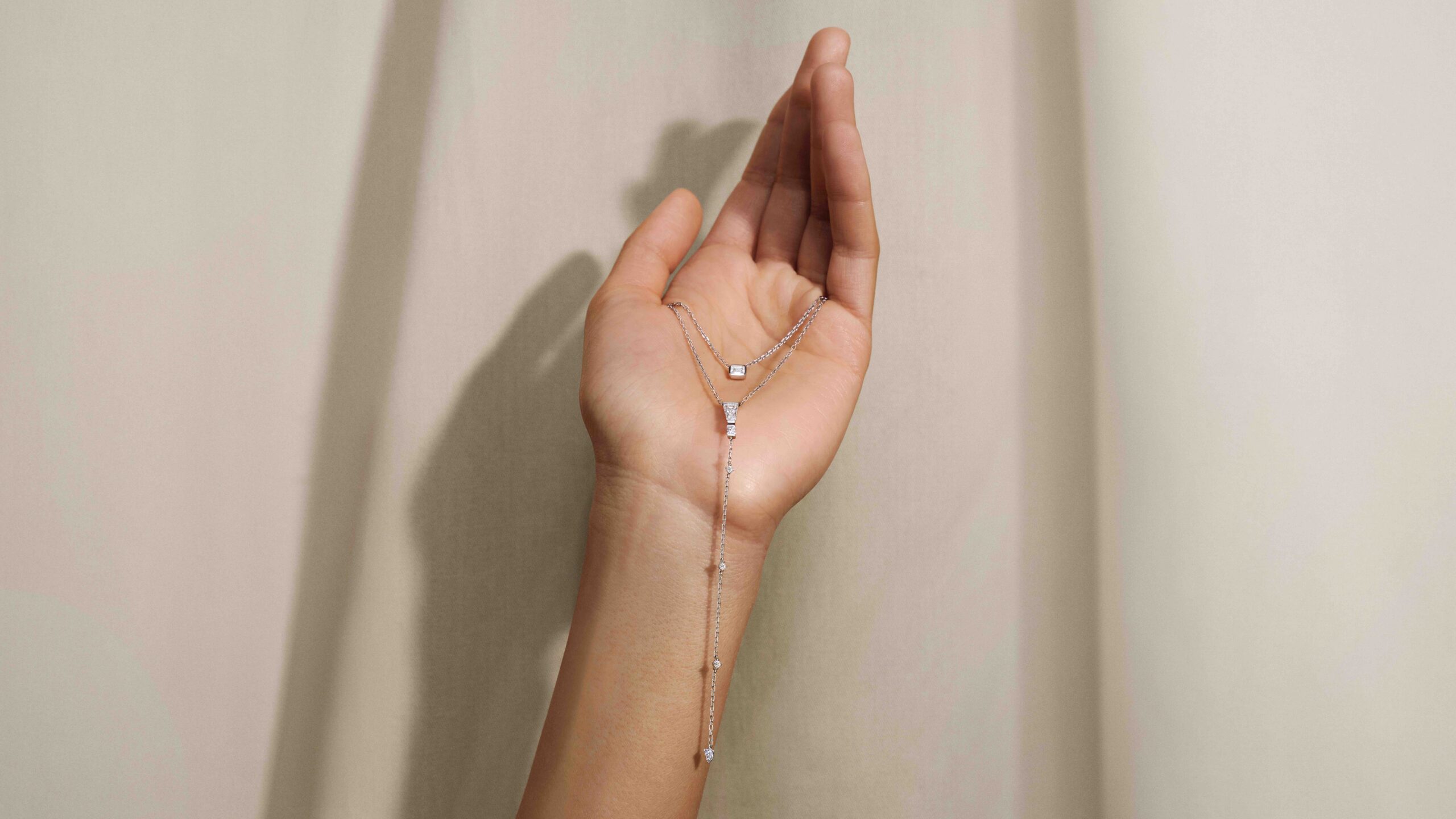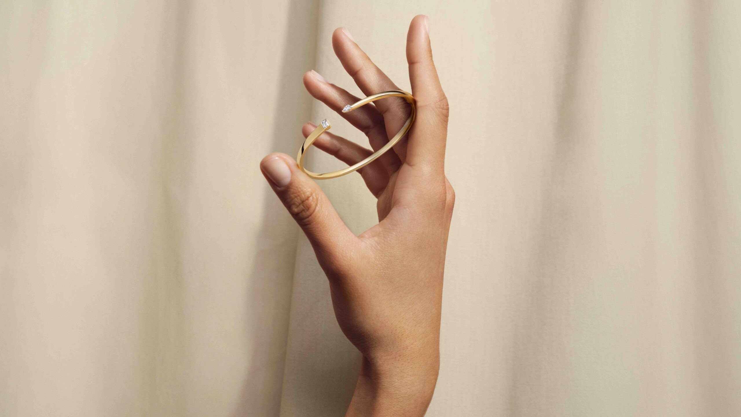 Ob in Kombination mit anderen Schmuckstücken oder individuell getragen, die Kreationen bilden stets magische Hingucker – von der asymmetrischen Dynamik der Y-förmigen Halskette, über die schwungvoll gearbeiteten Ringe bis zum Collier, dass das perfekt angewandte Zusammenspiel zwischen glänzenden Goldoberflächen und präzise geschliffenen Diamanten, wunderschön aufzeigt.
