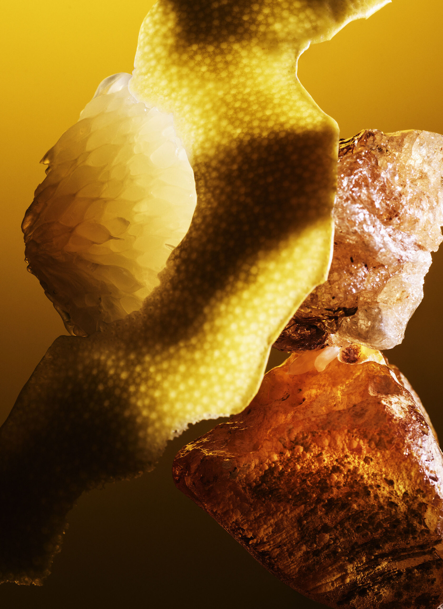 Unter diesem schimmernden Auftakt offenbart das Extrait seine kostbare Tiefe: eine luxuriöse Konzentration des Ambergris-Akkords – maritim und vergleichbar mit der Haut selbst – bekannt als der „geheimnisvolle Schatz des Meeres“. Seine gesteigerte Intensität und Komplexität werden durch die harzige Wärme des Siam Benzoin Absolues, ein reichhaltiger, harziger Balsam, verstärkt, der der Komposition Geschmeidigkeit und Fülle verleiht.