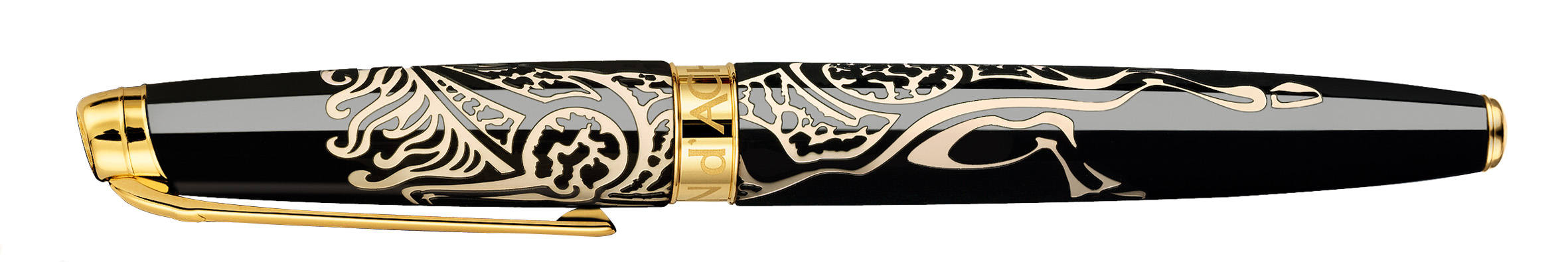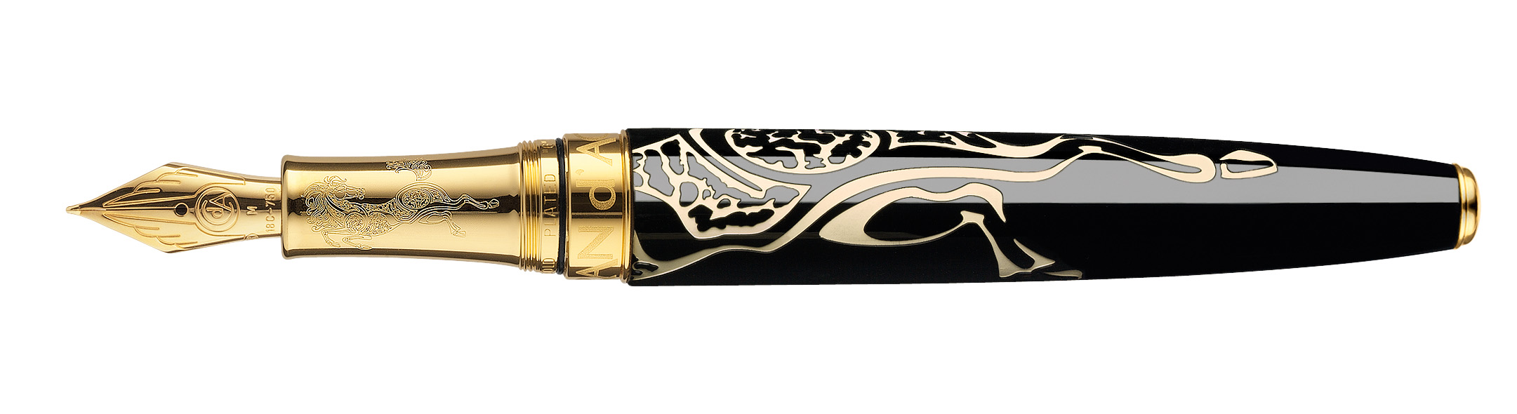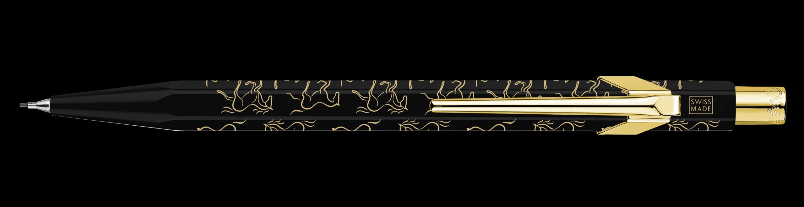 Erhältlich als Kugelschreiber oder Minenhalter, wird der schwarz lackierte Schaft dieser exklusiven Special Edition von goldenen Silhouetten galoppierender Pferde veredelt, die zugleich Bewegung, Kraft und Eleganz dieses ikonischen Tieres des chinesischen Tierkreises verkörpern. Die goldfarbenen Elemente, Clip und Druckknopf, setzen einen strahlenden Akzent und bilden einen eleganten Kontrast zum dunklen Schaft, wodurch die ganze Noblesse und Energie des Pferdes zum Ausdruck kommt.