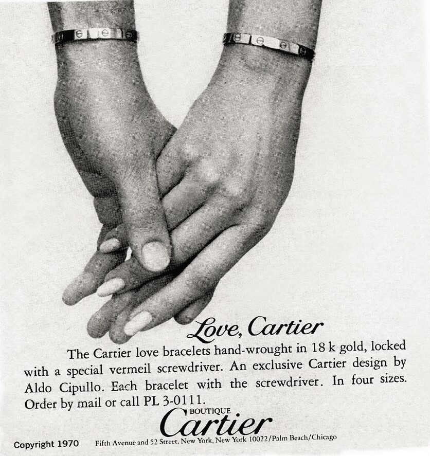 LOVE ist die Geschichte einer Schmuckikone, die mitten in der Kultur- und Kunstrevolution des Jahres 1969 entstand. Entworfen wurde der Armreif für Cartier New York vom Designer Aldo Cipullo, der aus der Künstlerszene damals nicht wegzudenken war. Sein radikaler Ansatz, die Schrauben des Armreifs offen zu zeigen, war damals ein wahres Designmanifest. Und so war der Armreif schon bald in einer legendären Werbekampagne in den grossen New Yorker Tageszeitungen zu sehen: Zwei einander haltende Hände – die einer Frau und die eines Mannes – jeweils geziert durch einen LOVE Armreif. Der Erfolg liess nicht lange auf sich warten.