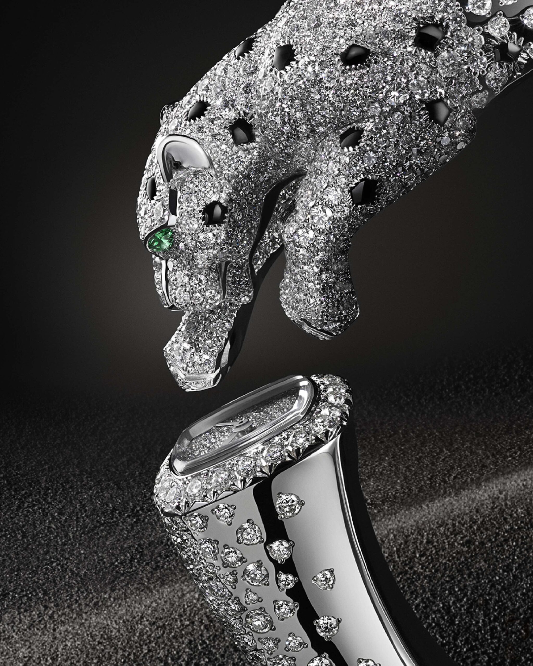 Die Schmuckuhr verbindet nicht nur Uhrmacher- und Juwelierkunst, sondern greift auch tief in der Geschichte der Maison verankerte Designelemente auf: einen dreidimensionalen, jederzeit sprungbereiten Panther sowie ein sogenanntes „Toi&moi“-Armband, das sowohl die ikonische Raubkatze als auch das zarte Design der Uhr in Szene setzt. Die aus Gelbgold gefertigte, skulpturale Nachbildung des Tiers zeichnet sich durch eine besonders ausgeprägte Muskulatur, eine detaillierte Abbildung von Nase und Ohren sowie präzise nachgeformte Ballenpolster unter den Tatzen aus. Mit Tsavoritaugen und einer Onyxnase versehen, kontrastiert der Panther mit dem Zifferblatt aus schwarzem Lack, der mit einem Diamant-Pavé versehenen Lünette und dem Diamant-Index bei 12 Uhr.