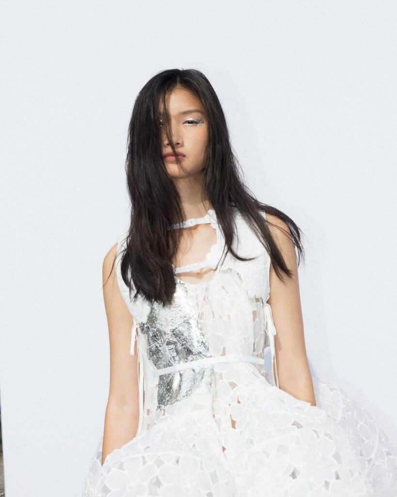 Die Show trug den Titel „Hana-bi“, das japanische Wort für Feuerblume, zusammengesetzt aus den Zeichen für „Blume“ und „Feuer“. Ein Symbol für Dualität, Zartheit und Störung. Darin findet Bahnsen eine passende Metapher für ihre eigene Sprache. Skulpturale Silhouetten, die in Weichheit geformt sind. Couture-Techniken, die mit Leichtigkeit getragen werden. Emotionen, eingefangen in stillen Momenten. Wie ein Feuerwerk öffnete sich die Kollektion in Weiß, rein und leuchtend, bevor sie in Silber überging. Dieser Farbwechsel, ein Markenzeichen ihrer Shows, markierte hier die Entwicklung. Ein Lichtblitz, eine Blüte, ein Funke. „Jedes Mal, wenn ich eine neue Kollektion beginne, starte ich mit Weiß“, teilte Cecilie mit. „Es fühlt sich wie eine Leinwand an.“