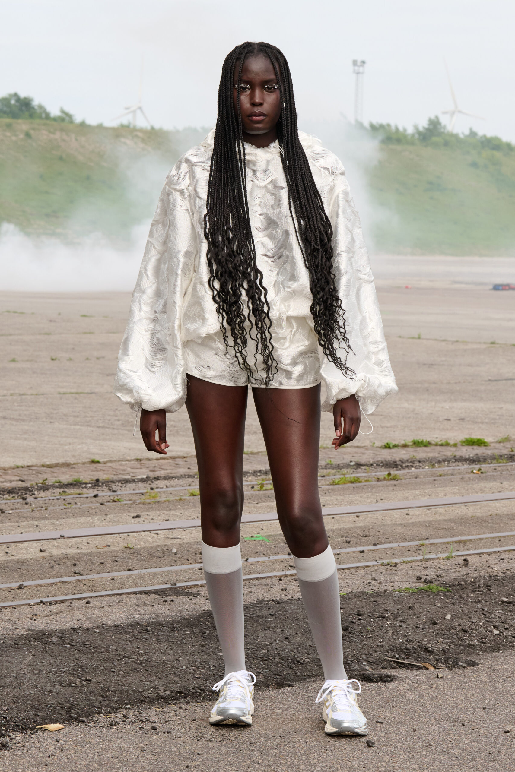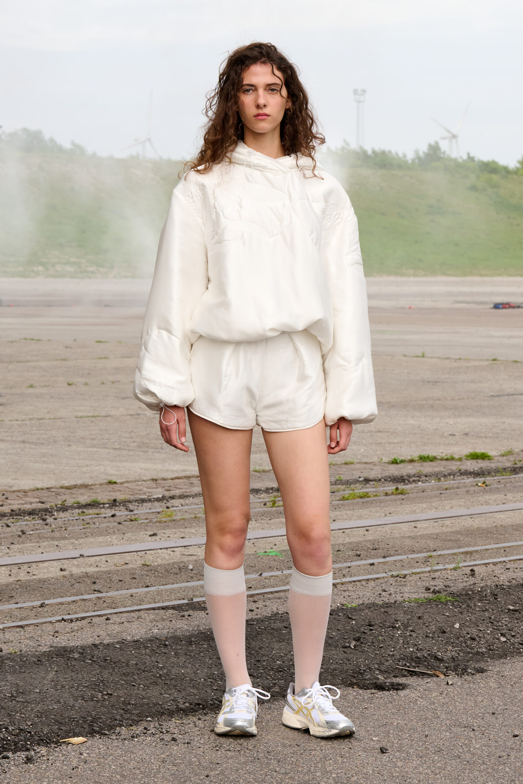 Die Show wurde zu einem offenen Brief an Kopenhagen. Eine Einladung, vielleicht, dass die Stadt sich selbst in der Arbeit sieht. Untermalt von einer Partitur von August Rosenbaum, einem Soundtrack, der ein Gefühl von Nostalgie, aber auch eine rohe Einfachheit vermittelte. Hypnotische Beats, stimmungsvolle Atmosphären und eine eindringliche, ungeschliffene Schönheit. Alles ergänzt durch Beth Gibbons’ Stimme und Ton, die pure Emotion verkörperten. Mit Models, die aneinander vorbeistreiften und ein Gefühl von Freiheit und Leichtigkeit ausstrahlten. Die Atmosphäre war traumhaft, sich ständig wandelnd, die Kleidungsstücke tauchten auf und lösten sich in einem subtilen Nebel auf. Malerisch statt explosiv. Als der letzte Look erschien, endete die Show nicht mit einem Crescendo, sondern mit einem sanften Einschlag.