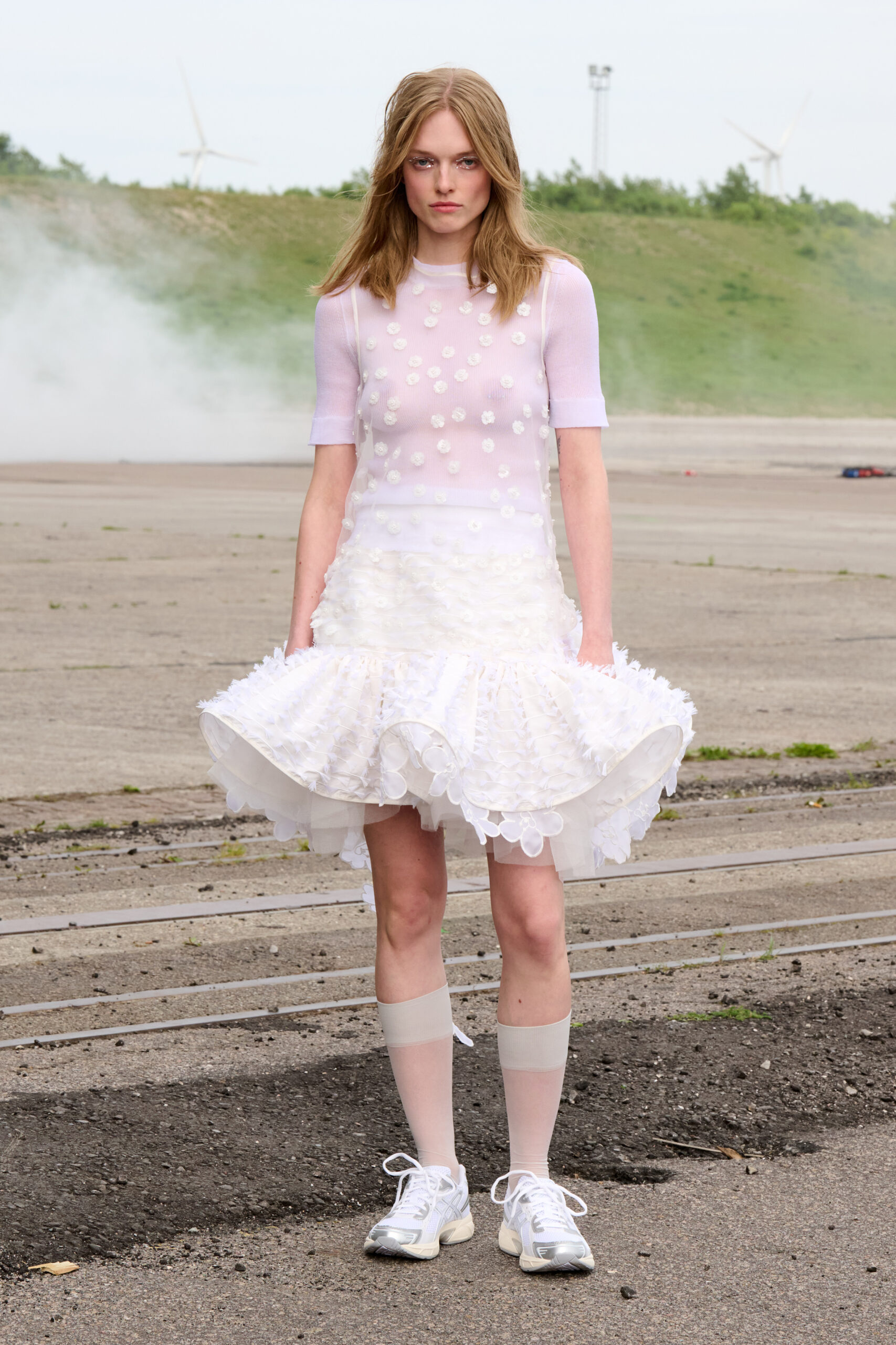 Um sich auf diese Show vorzubereiten, wurde das gesamte Archiv offengelegt. Stücke, die in Erinnerung geblieben sind, und Stücke, die losgelassen wurden. Eine Meditation darüber, was weitergetragen werden soll und was es verdient, erneut gesehen zu werden. Das Ergebnis war eine kuratierte Mischung aus Archivstücken in neuen Iterationen, einmaligen Showstücken und neuen Kreationen, die nicht nur die Zeitlosigkeit der Marke, sondern auch ihren Fortschritt offenbarten. Es war eine Collage aus Vergangenheit und Gegenwart. Einzigartige Kleidungsstücke, die aus einem Jahrzehnt der Kreation entstanden sind. Broderie-Anglaise-Fronten kombiniert mit seiden gequilteten Rückseiten. Pailletten-Slips, die unter luftigen Röcken hervortreten. Silhouetten, die umgekehrt oder neu zusammengesetzt wurden. Was mit Raffinesse beginnt, entfaltet sich zu Überschwänglichkeit, wird wilder, freier, bleibt jedoch immer in der Reinheit des Universums des Hauses verankert.