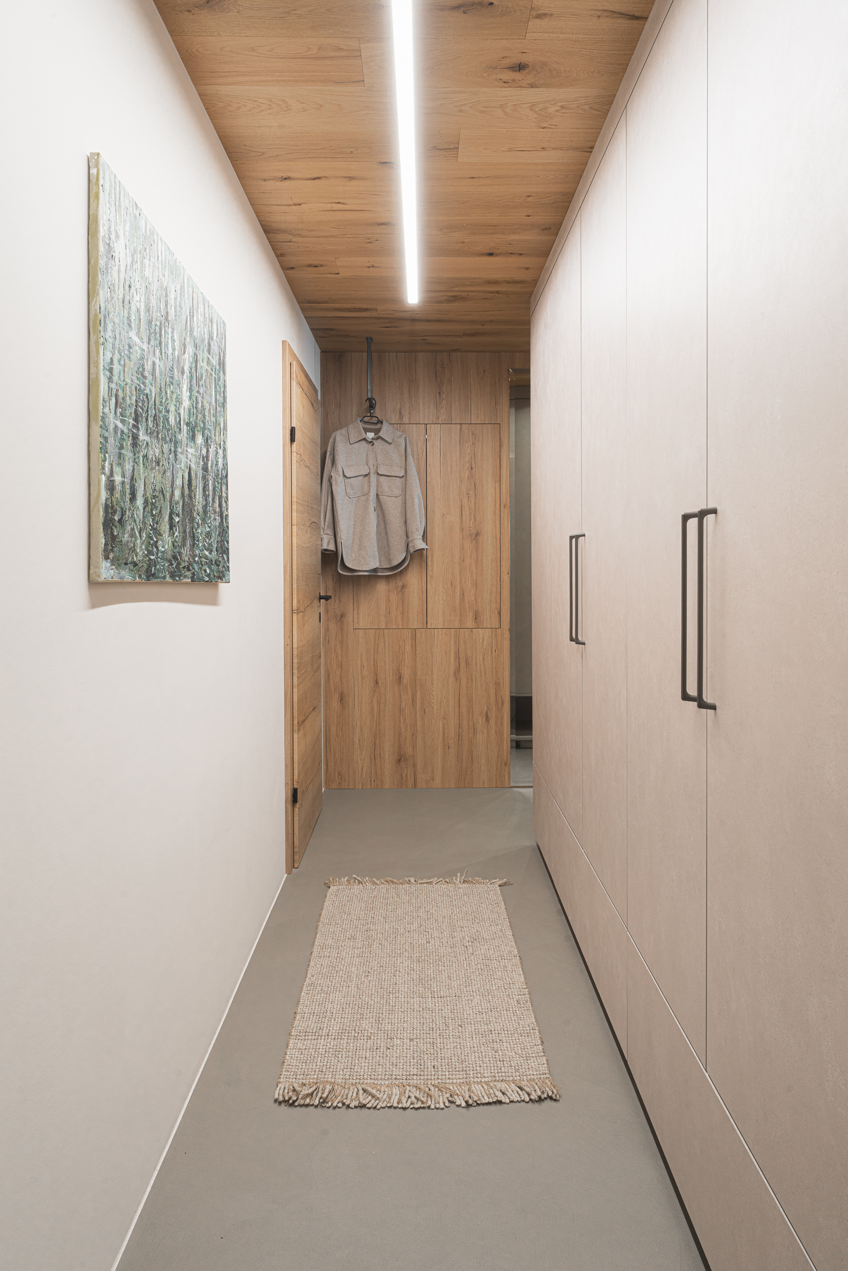 - Eine clevere Designvariante, bei der Holzböden an der Decke zum Einsatz kommen und eine taktile Spachteltechnik für die Bodenbeschichtung verwendet wird – Wärme und Innovation verbinden.