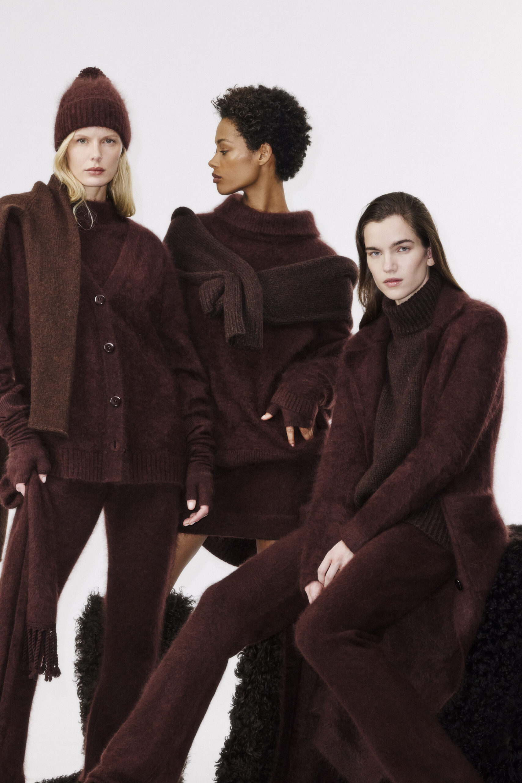 Die Farbpalette reicht von Espresso Black über Chocolate und Cinnamon Spice bis hin zu Marshmallow und Matcha Green – eine harmonische Komposition, die Geborgenheit und Stil vereint. Softeste Layers aus Merino und Kaschmirdefinieren „Coziness“ neu, während moderne Sixties-Vibes mit Black-&-White-Looks, Shift-Silhouetten, verkürzten Coats und Stehkragen für selbstbewusste Retro-Noten sorgen.