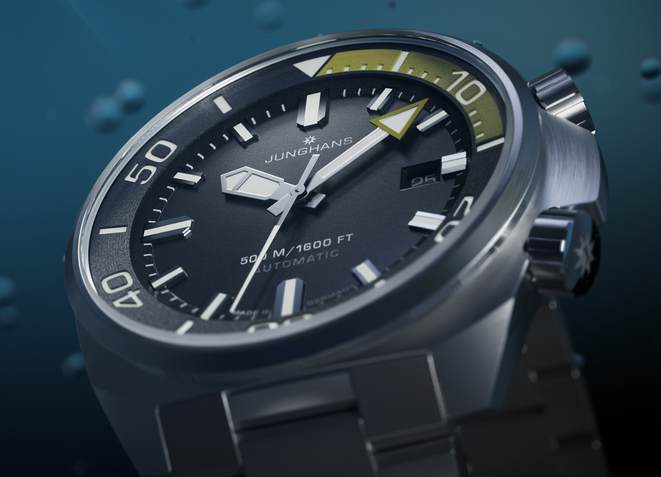 Getragen wird die Aquaris Diver wahlweise an einem dreigliedrigen Edelstahlband oder einem Band aus synthetischem Kautschuk. Das Stahlband verfügt über eine Faltschliesse mit zwei Möglichkeiten zur Verlängerung. Zum einen die bei Taucheruhren übliche Klappverlängerung, die 26 mm zusätzliche Länge bietet, zum anderen die Junghans-eigene Rasterverstellung mit 22 mm Verlängerungsoption. Letztere lässt sich auch bei geschlossener Schliesse bedienen. Eine Klick-Ball-Verriegelung verhindert unbeabsichtigtes Öffnen der Schliesse, während die Quick-Release-Funktion einen bedienungsfreundlichen Bandwechsel ermöglicht. Jede Uhr wird zusätzlich mit einem robusten, synthetischen Kautschukband in Orange oder Schwarz geliefert – inklusive Tauchverlängerung.