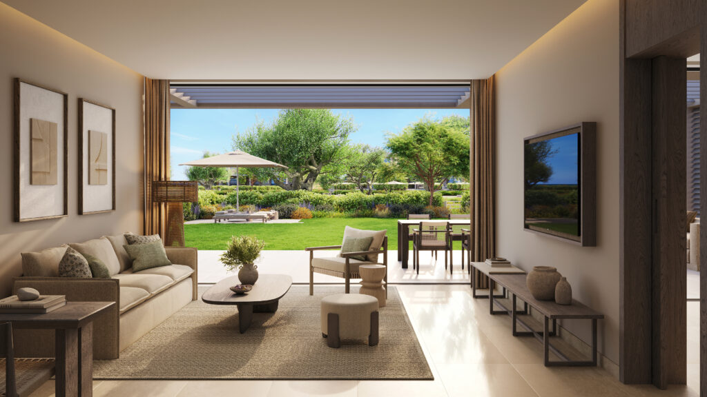 Architektonisch greift das Resort die natürliche Umgebung und die kulturellen Wurzeln der Insel auf. Inspiriert von minoischen Elementen und der kretischen Handwerkskunst verschmelzen Innen- und Aussenbereiche fliessend miteinander. Warme Naturtöne, Olivgrün und Terrakotta, kombiniert mit Holz, Faser und Naturstein, schaffen eine entspannte, mediterrane Atmosphäre. Lavendelfelder, Kräutergärten und jahrhundertealte Olivenhaine betten das Resort in die umliegende Landschaft ein.
