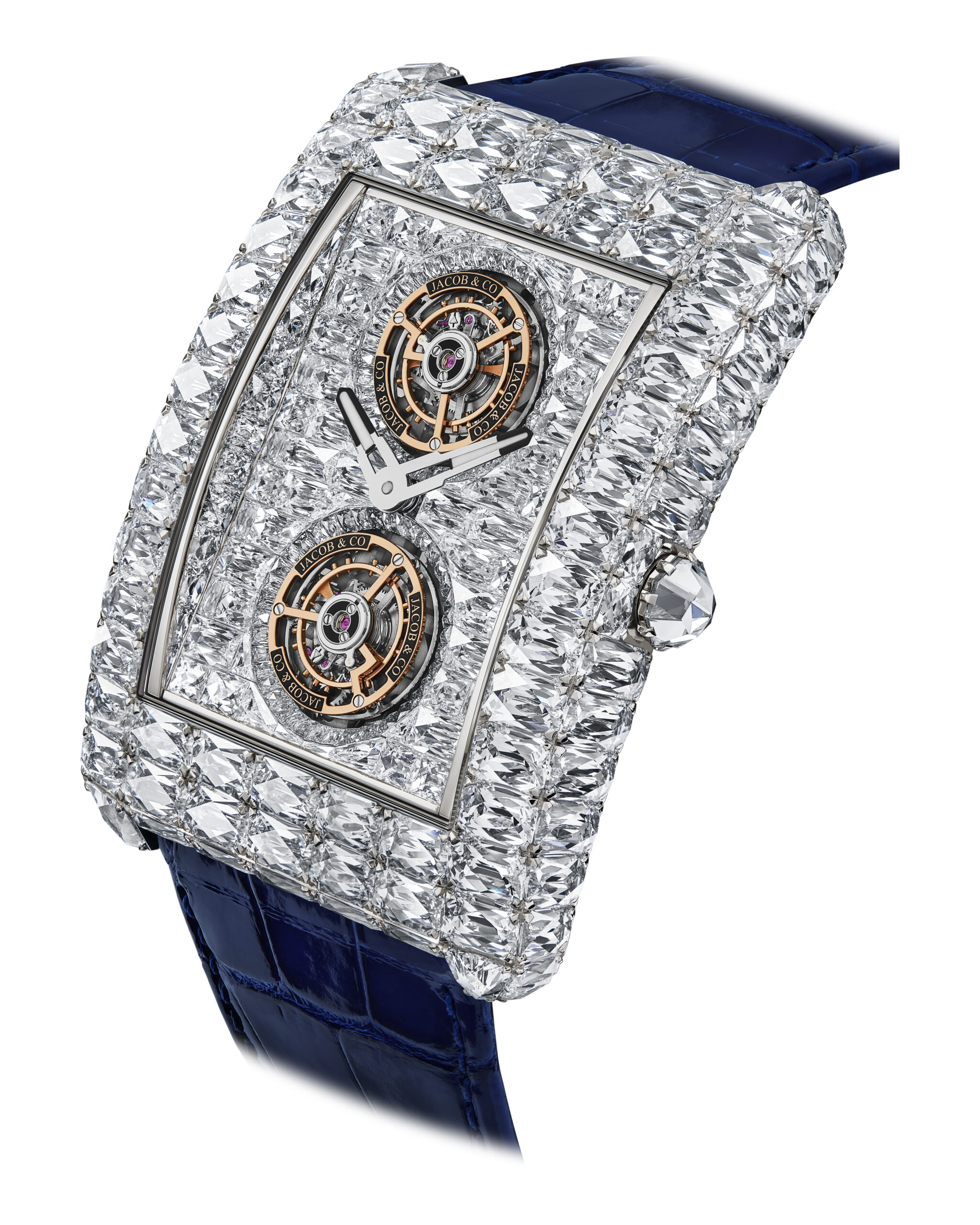 Um diesen neuen patentierten Schliff vorzustellen, präsentiert Jacob & Co. den Billionaire Double Tourbillon Angel Cut, die erste Uhr, die je mit Angel Cut-Diamanten besetzt wurde.