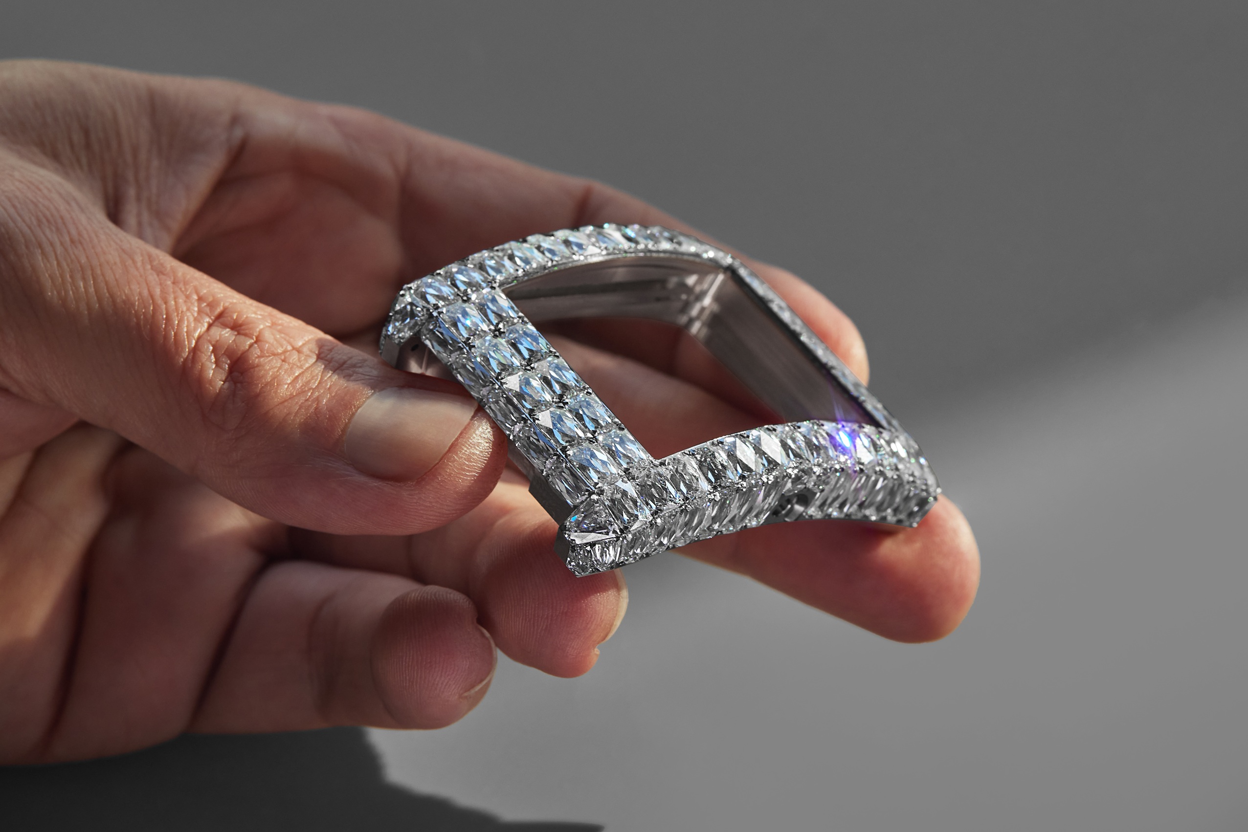 Sein 54 x 41 mm großes Weißgoldgehäuse wird von 98 Angel Cut-Diamanten mit insgesamt 51,13 Karat beleuchtet, viele davon ungewöhnlich große Steine, Proportionen, die meist für Mittelstück-Diamanten reserviert sind. Das Zifferblatt erweitert diese ununterbrochene Lichtarchitektur durch eine weitere Anordnung von 88 Angel Cut-Diamanten und Baguette-Steinen, die die doppelten Tourbillon-Öffnungen symmetrisch und brillant einrahmen. Insgesamt ist die Uhr mit 298 weißen Diamanten besetzt, die insgesamt etwa 79 Karat ausmachen.