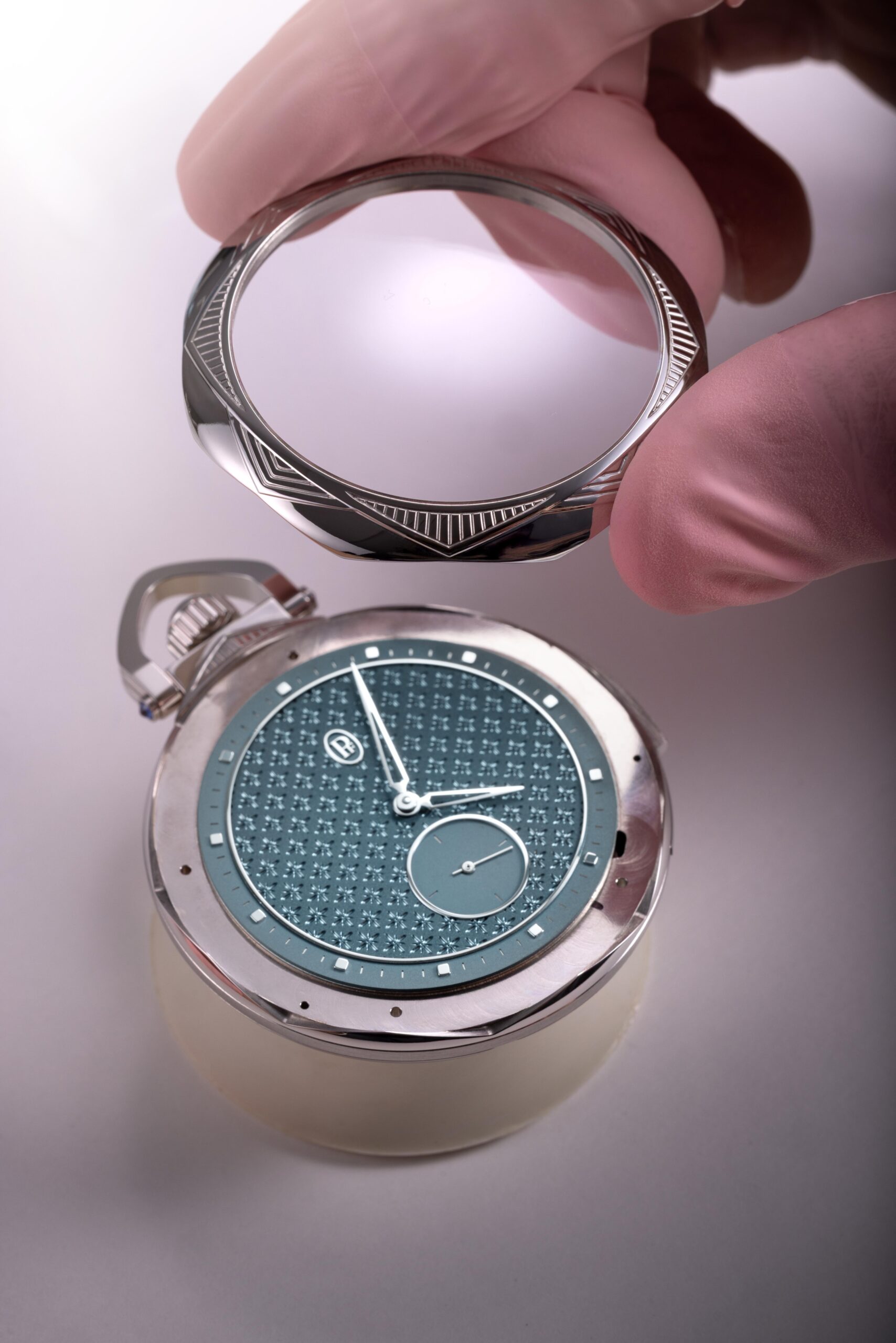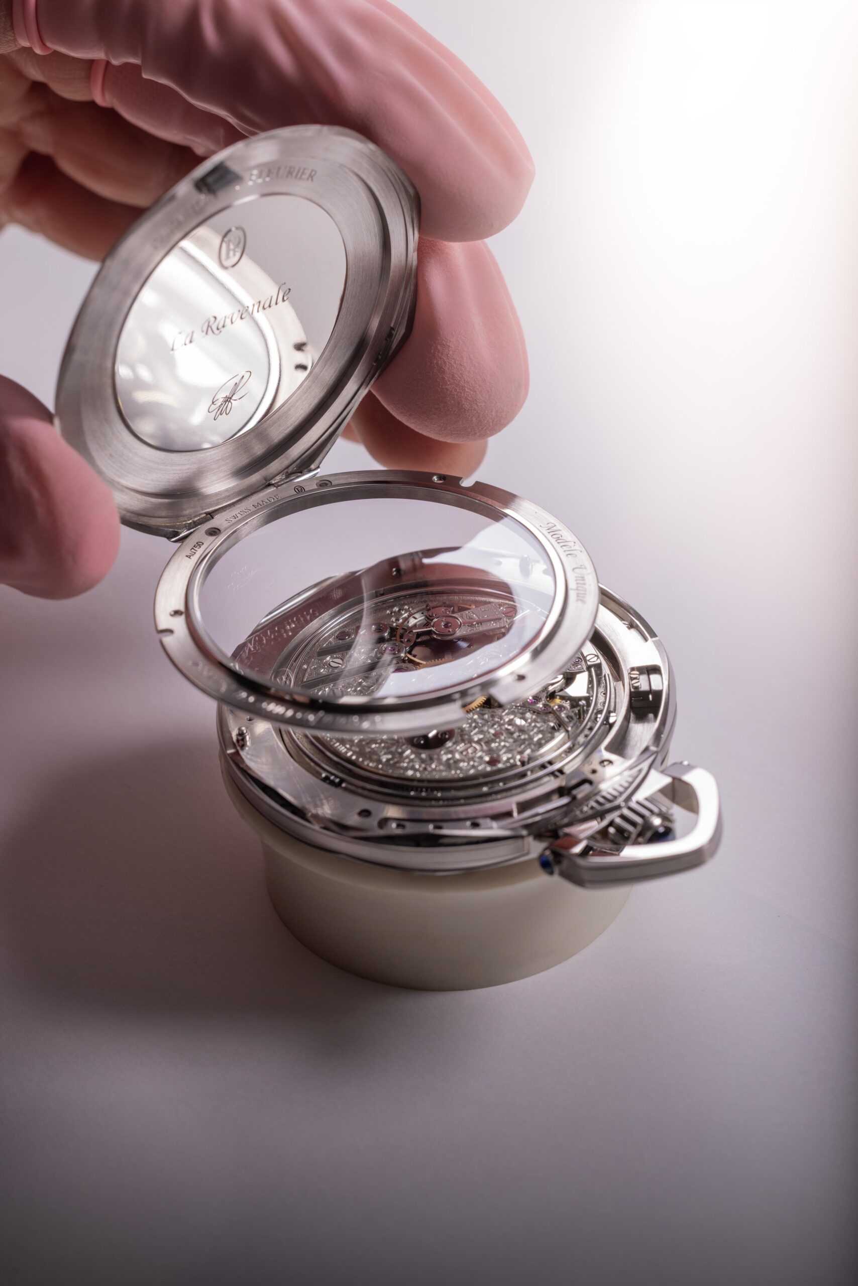 Die einzigartige Lépine-Taschenuhr ist ein Dialog von Geometrie und Natur und ist als Ausdruck höchsten uhrmacherischen Savoir-faire konzipiert. Mittelpunkt ist ein historisches Kaliber mit Minutenrepetition aus den 1920er Jahren, das sorgsam überarbeitet wurde. Der Klang der Mechanik wurde durch die meisterhafte Restaurationskunst des Maison zu neuem Leben erweckt.
