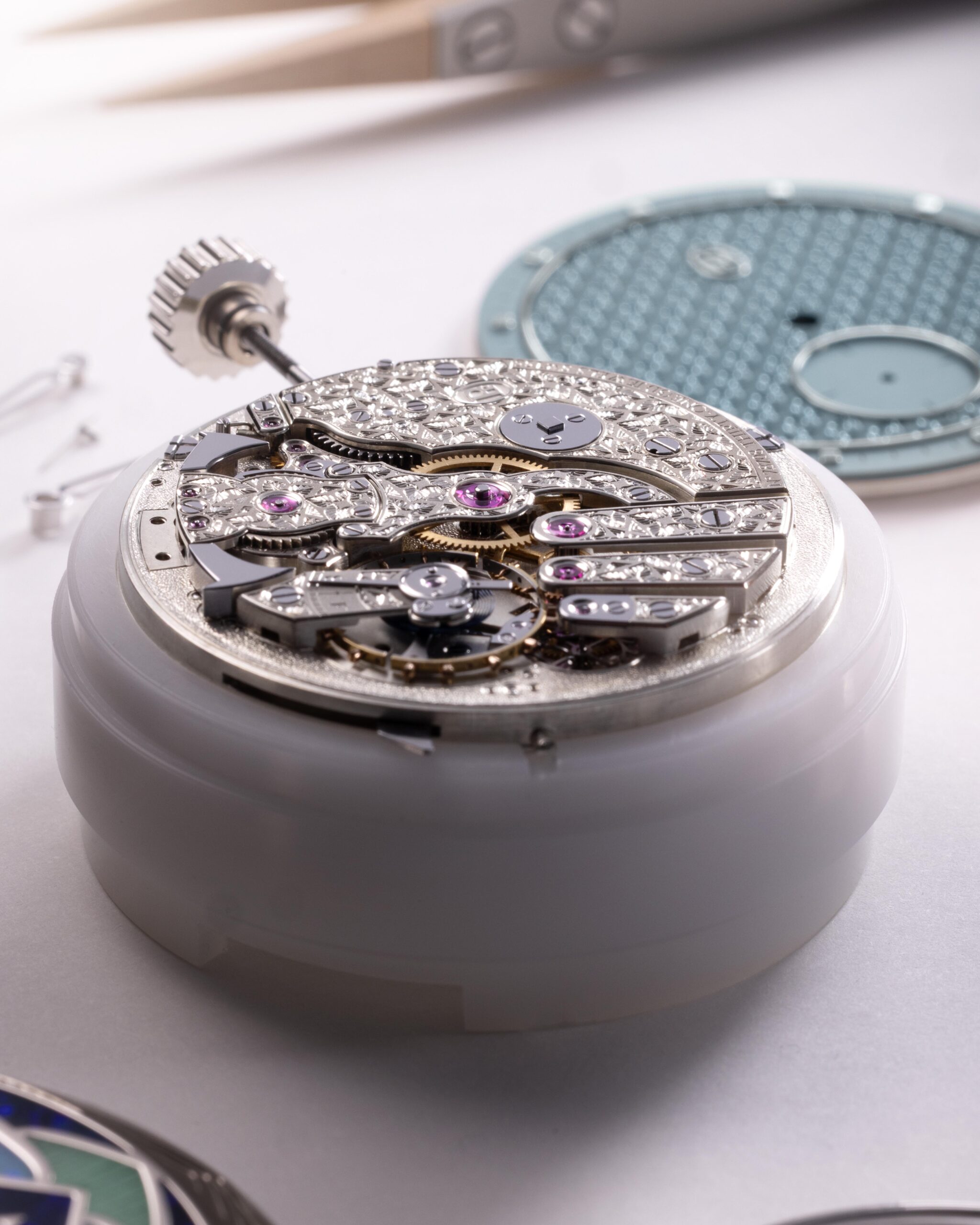 Mit den Gravurarbeiten wurde das Atelier Blandenier beauftragt – eines der wenigen Schweizer Ateliers, das sich ausschliesslich der traditionellen Handgravur für die Haute Horlogerie widmet. Diese Kunst erstreckt sich auch auf die Veredelung des Uhrwerks.