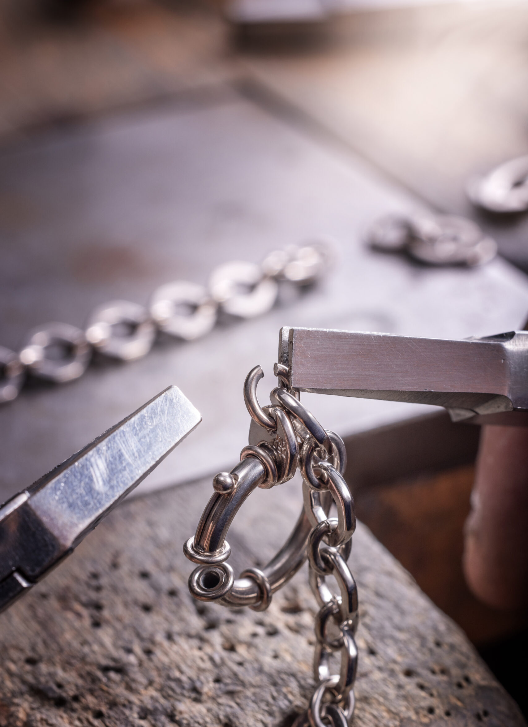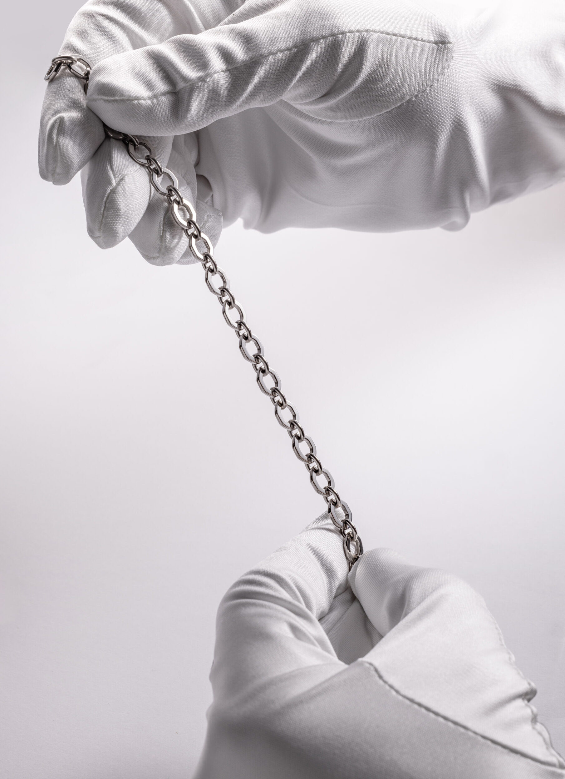 Die Kette – gefertigt von Laurent Jolliet, dem letzten Kettenmachermeister der Schweiz – besteht vollständig aus 18-karätigem Weissgold. Hexagonal geformte Kettenglieder spiegeln die Geometrie des Bügels über der Krone wider, während ovale Kettenglieder die elliptische Form des Markenemblems „PF“ aufgreifen.