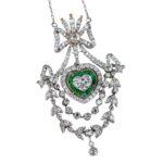 Das exquisit gearbeitete Belle-Époque-Collier aus Platin, besetzt mit funkelnden Diamanten und leuchtenden Smaragden, setzt mit einem atemberaubenden herzförmigen Diamanten, ein unvergleichliches Statement. Ebenso faszinierend ist der vom Art Déco inspirierteAquamarin- und Diamantring, der einen makellosen, 5,52 Karat schweren ovalen Aquamarin präsentiert – elegant flankiert von Diamanten im französischen Schliff.