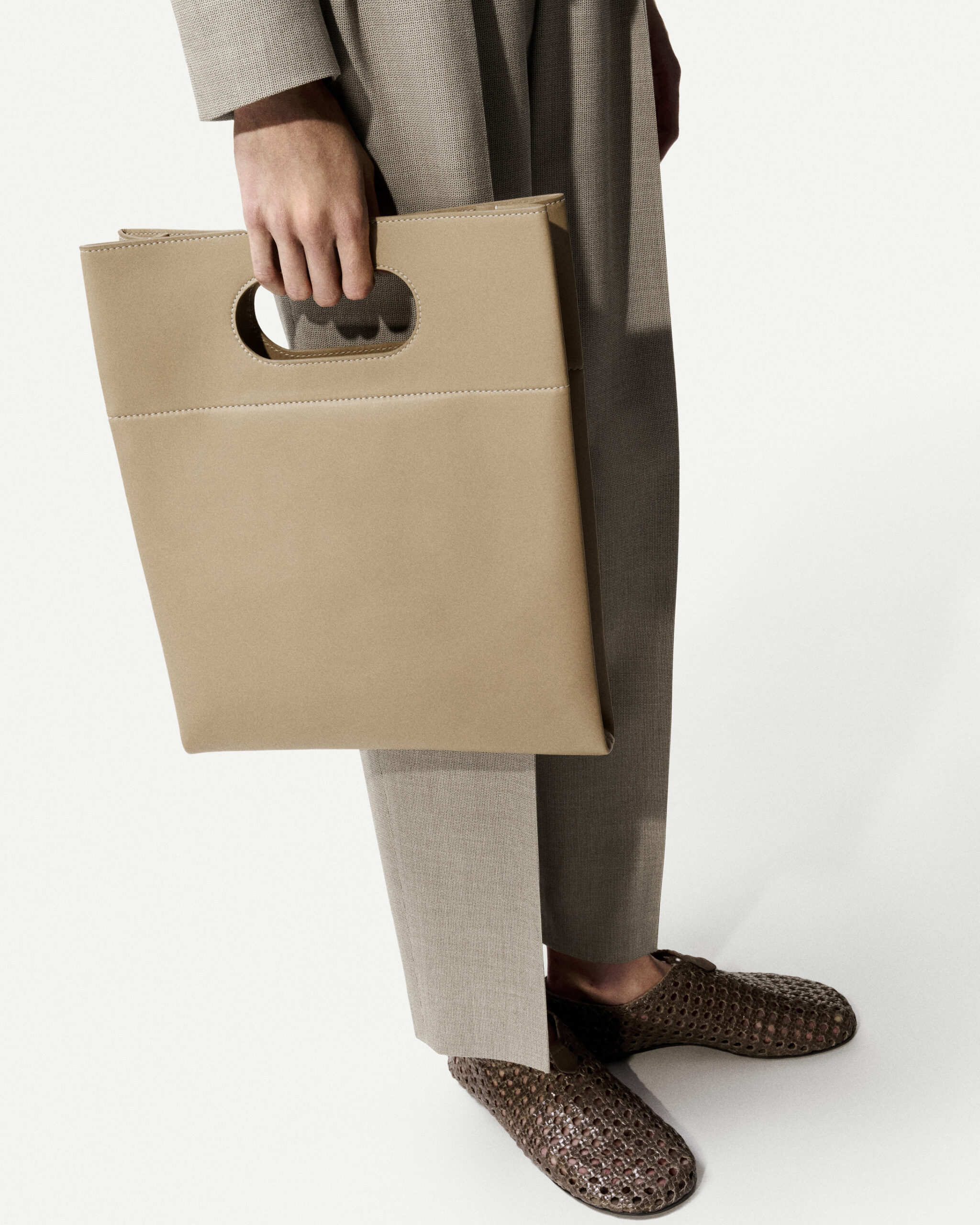 In Italien wird sie aus einem einzigen Stück geschmeidigem, natürlich glattem Kalbsleder ganz ohne Metallelemente von Hand gefertigt. Das Ergebnis ist ein nahtloses, puristisches Design mit einer aussergewöhnlichen Haptik. Der Griff ist auf das Wesentliche reduziert und wird präzise aus dem Leder herausgeschnitten. Eine dezent eingeprägte Loro-Piana-Signatur rundet das Erscheinungsbild ab.