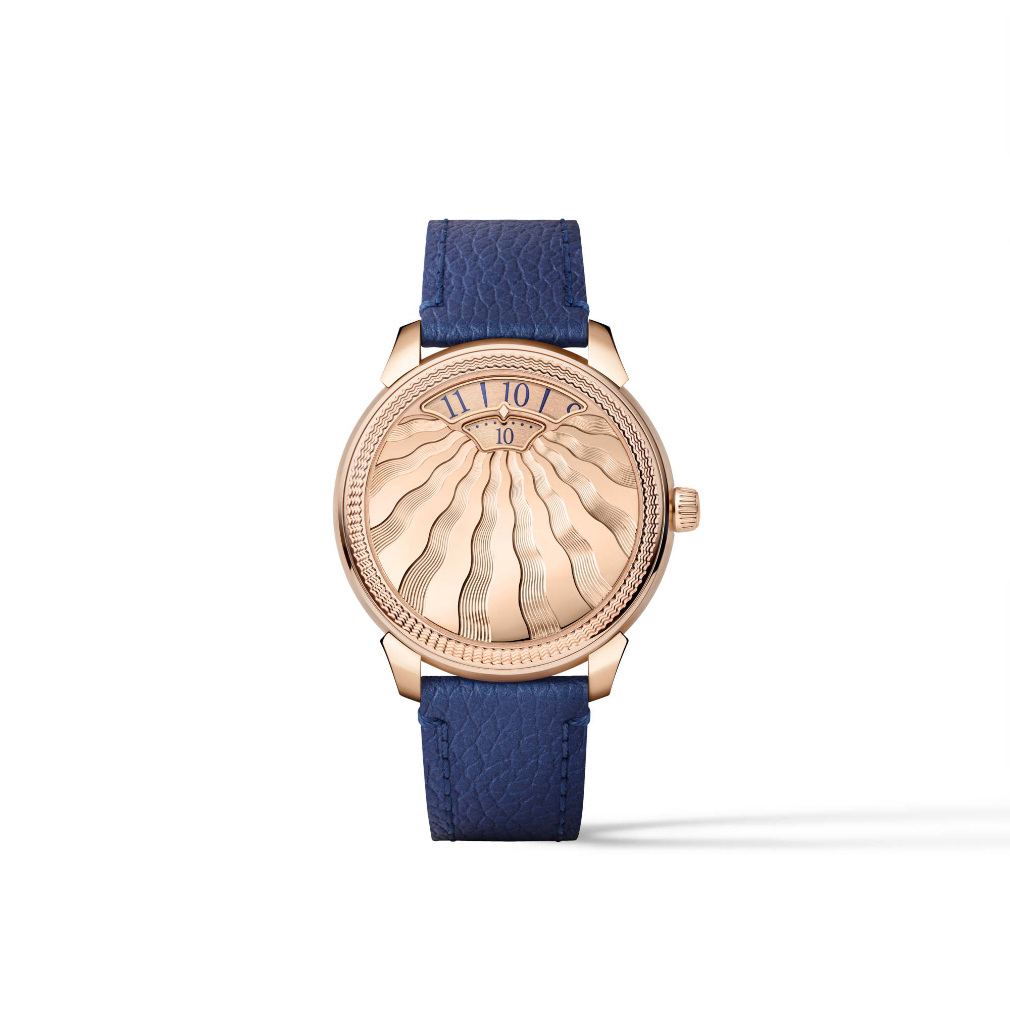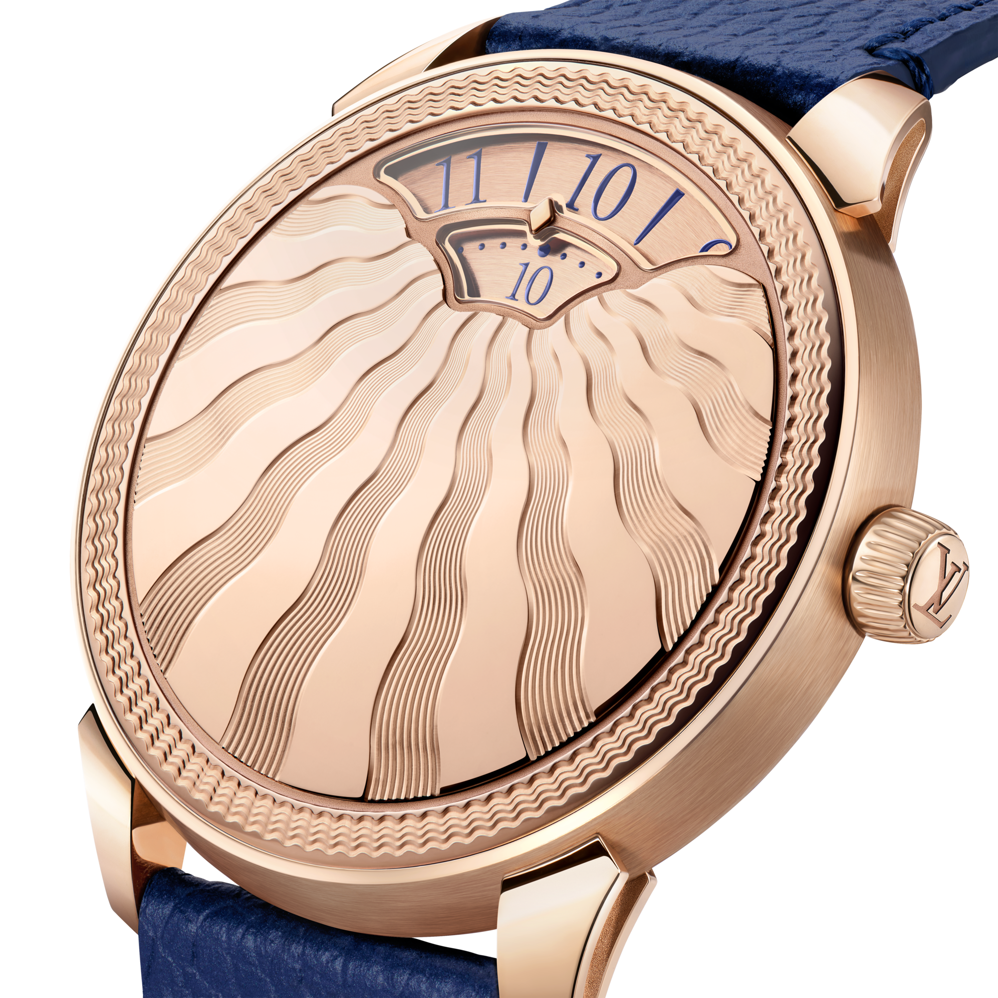 Die Tambour Convergence Guilloché vereint zwei unterschiedliche Formen des handgedrehten Guillochage. Auf der roségoldenen Oberfläche des Gehäuses entfaltet sich zunächst ein Kranz konzentrischer Wellen, während vom Zentrum des Zifferblattfensters strahlenförmige Linien ausgehen. Die leicht gewölbte Form des Gehäuses verleiht dem Dekor zusätzliche Tiefe und ein aussergewöhnliches Spiel aus Licht und Schatten.