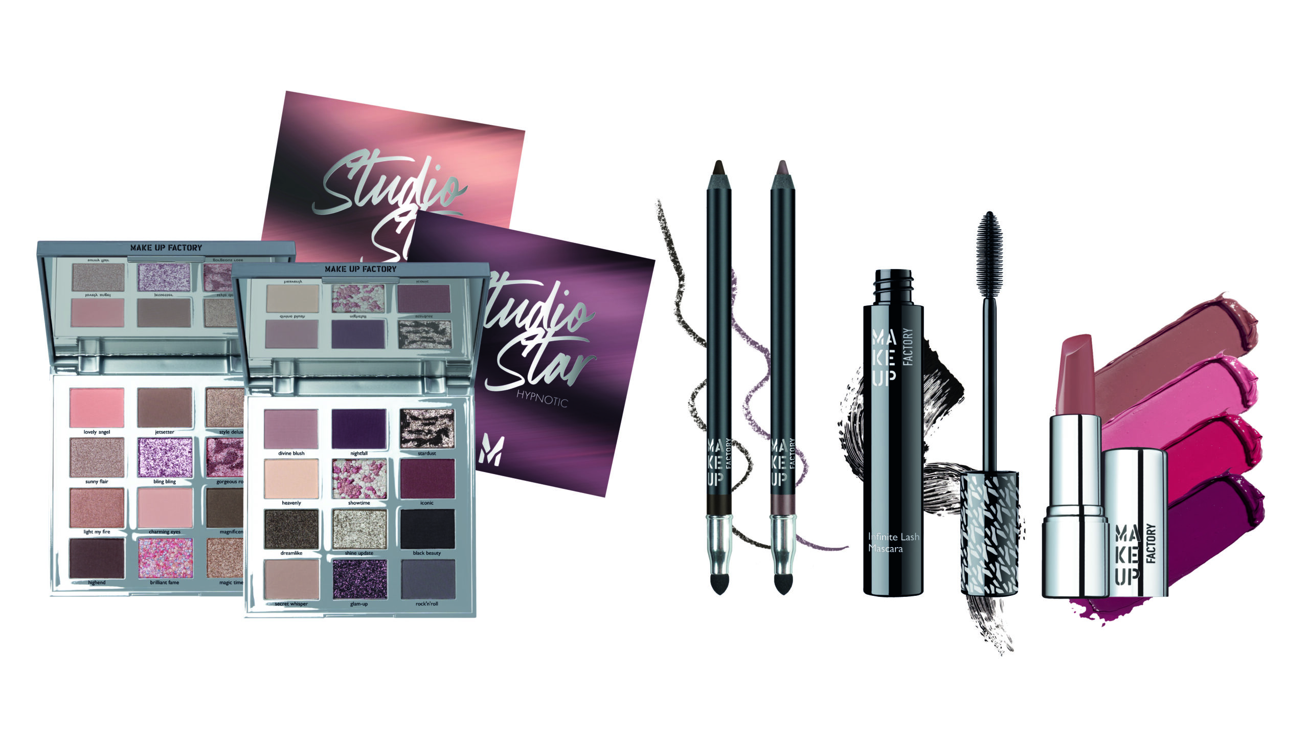 Die limitierte Studio Star Eye Palette begeistert mit zwölf metallischen, matten, satinierten und glitzernden Puderlidschatten. Die seidig-weiche Textur lässt sich leicht verblenden, die Nuancen können in unzähligen Varianten miteinander kombiniert werden und zaubern so immer wieder einen neuen Look. Die Deckkraft ist aufbaubar, die Lidschatten sind gleichmässig im Auftrag und lassen sich leicht verblenden. Das silberne Packaging macht die Palette auch optisch zum Highlight. Zwei neue Paletten in verschiedensten Erdtönen kreieren den perfekten Look für jeden Anlass: „Legendary“ No. 10 und „Hypnotic“ No. 20. Die vegane Studio Star Eye Palette ist mineralöl, paraben- und parfümfrei. Die Hautverträglichkeit ist dermatologisch bestätigt.
