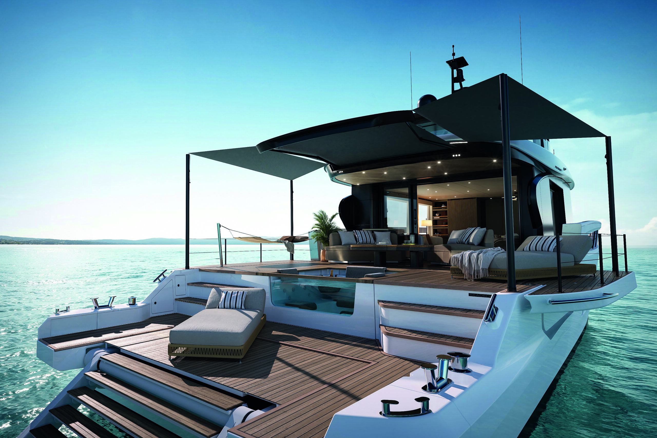 auf soziale Interaktion und Entspannung ausgerichtet sind. Am Heck schaffen drei grosszügige, auf unterschiedlichen Ebenen angeordnete Terrassen eine fliessende, immersive Verbindung zum Meer und begleiten die Gäste sanft und selbstverständlich bis an das Wasser heran.