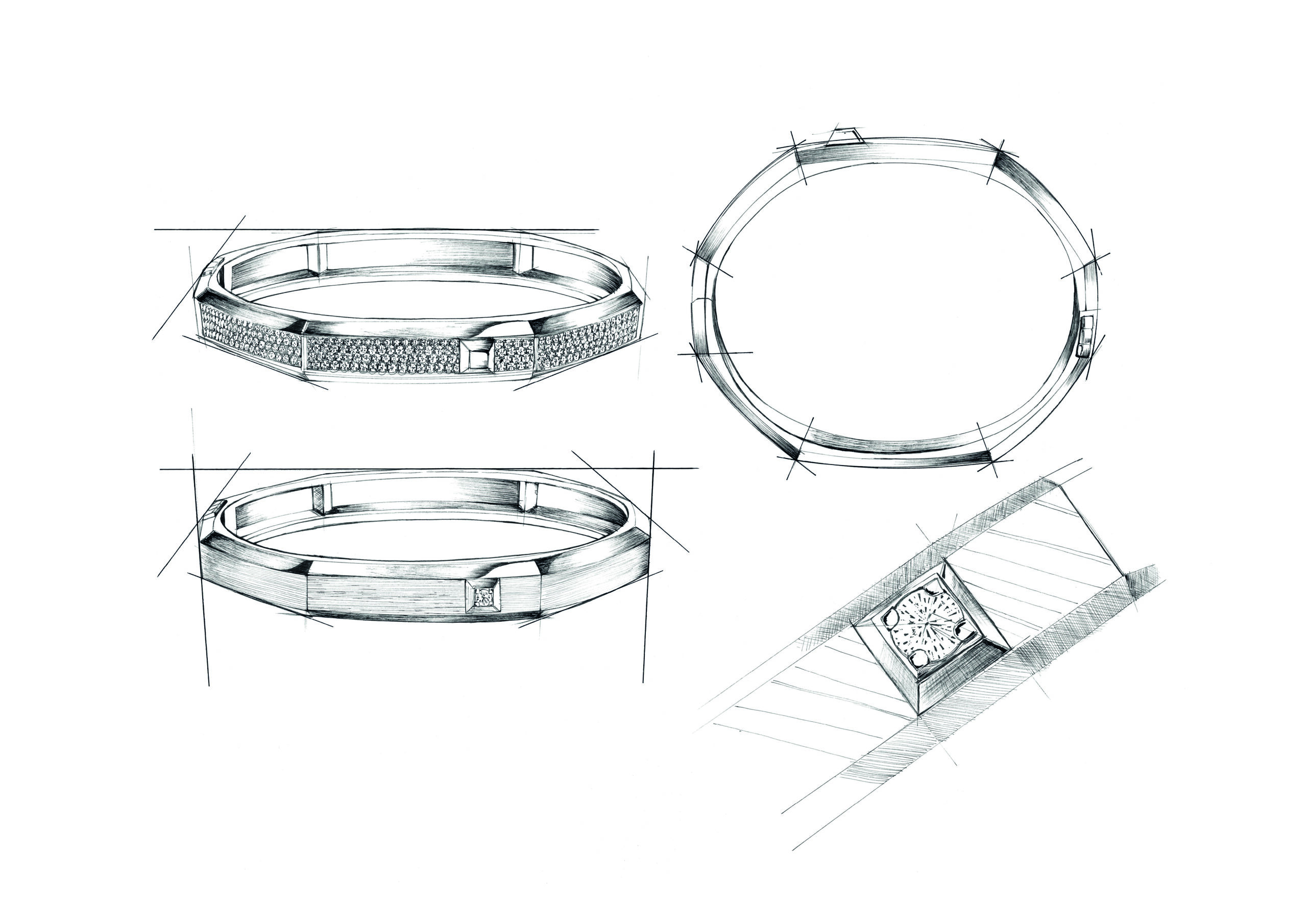 Im Mittelpunkt steht ein markanter Armreif – die Signatur der Linie. Ergänzt wird er durch Ringe, Ohrringe und Halsketten, darunter eine Torque-Kette sowie eine Krawattenkette mit präzise gleitendem Diamant-Element.