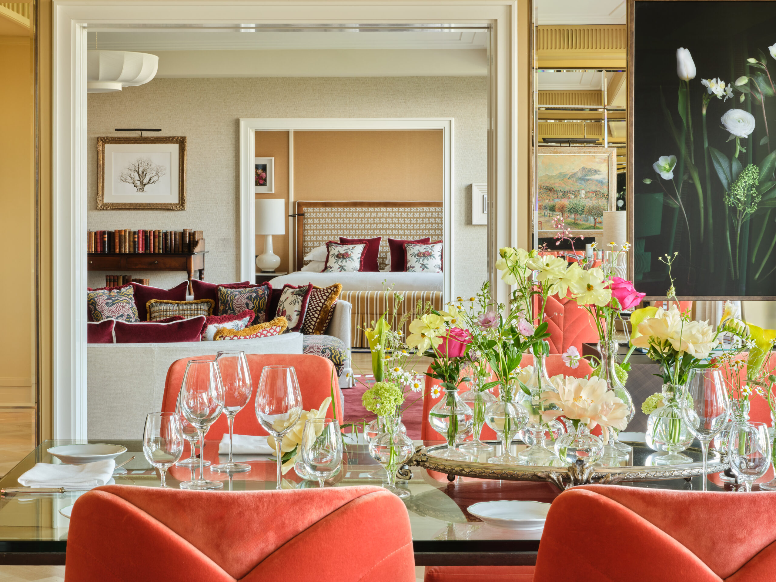 Die Monforte Royal Suite ist das Highlight der Neugestaltung des The Charles Hotels und nach Ansicht von Lady Olga die schönste Suite der gesamten Rocco Forte Hotel – Kollektion. Mit ihren großzügigen Abmessungen und vielen Details wirkt sie eher wie eine elegante Privatresidenz als wie eine Hotelsuite. „Heutzutage sind Hotels eher wie Wohnungen und Wohnungen oft eher wie Hotels“, sagt sie. Jedes Element wurde sorgfältig ausgewählt: edle Stoffe, charakteristische Kunstwerke und Möbel, die man auch für sein eigenes Zuhause aussuchen würde. „Wenn mir ein Stoff, ein Gemälde oder ein Möbelstück für mich selbst nicht gefällt, würde ich es niemals für die Gestaltung unserer Zimmer verwenden.“ Das Ergebnis ist ein Raum, der individuell, komfortabel und zurückhaltend opulent wirkt.