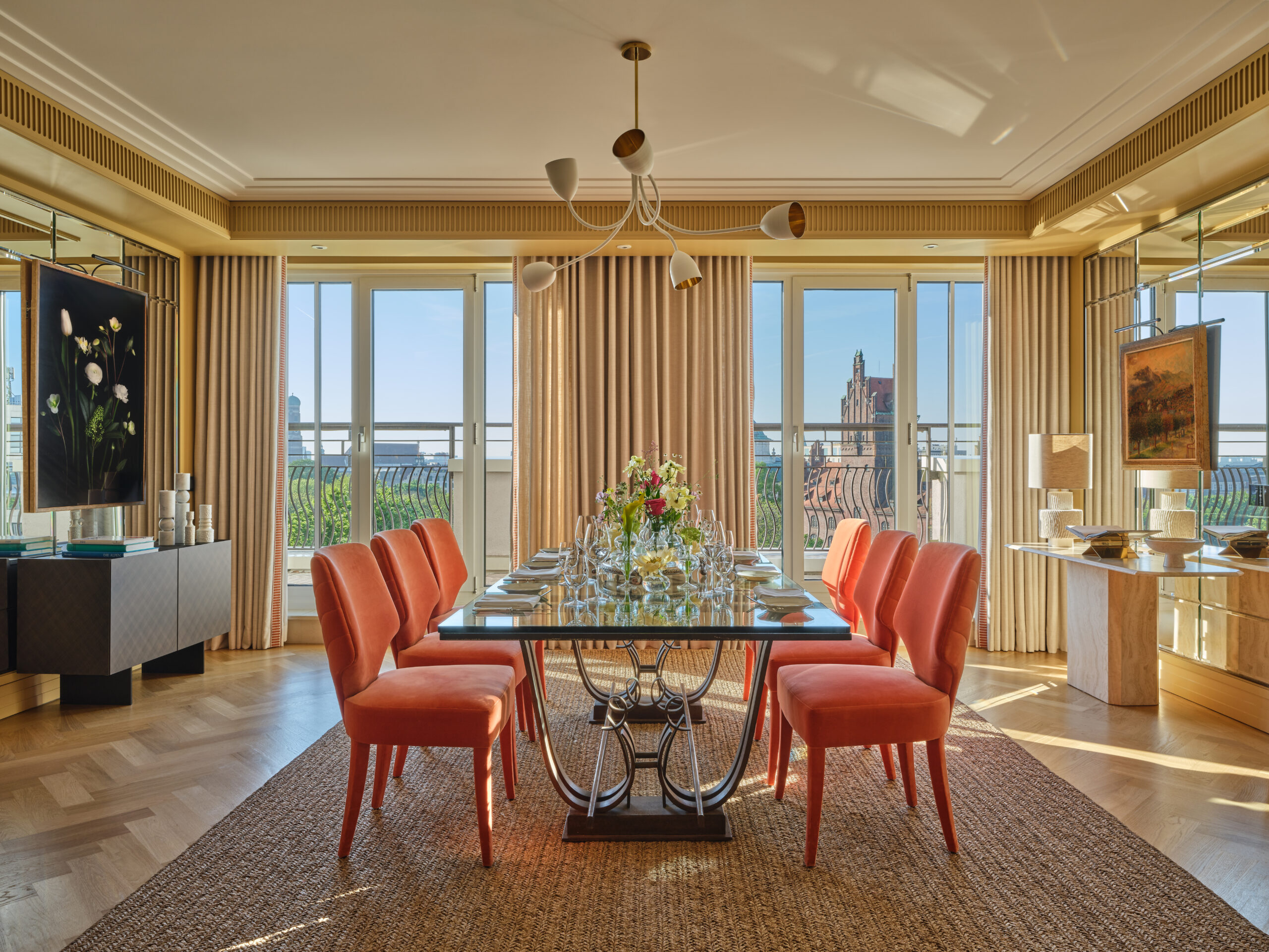 Die private Außenterrasse bietet einen atemberaubenden Blick über die Baumkronen des Alten Botanischen Gartens und auf diverse, architektonische Wahrzeichen Münchens. Die 200 Quadratmeter große Suite besticht durch ein offenes Raumkonzept, bei dem die verschiedenen Räume durch große Doppeltüren miteinander verbunden sind und so nicht nur ein Gefühl von Weite vermittelt wird, sondern gleichermaßen ein Gefühl der Verbundenheit und des fließenden Austauschs.