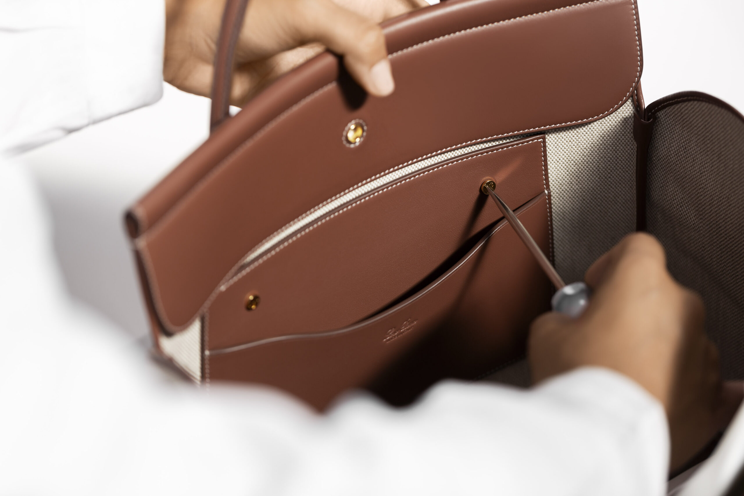 Das geschmeidige Leder legt sich sanft über eine verborgene Metallstange und umschmeichelt die Form der Tasche, die subtil an einen Webstuhl erinnert und damit die textile Expertise von Loro Piana unterstreicht.