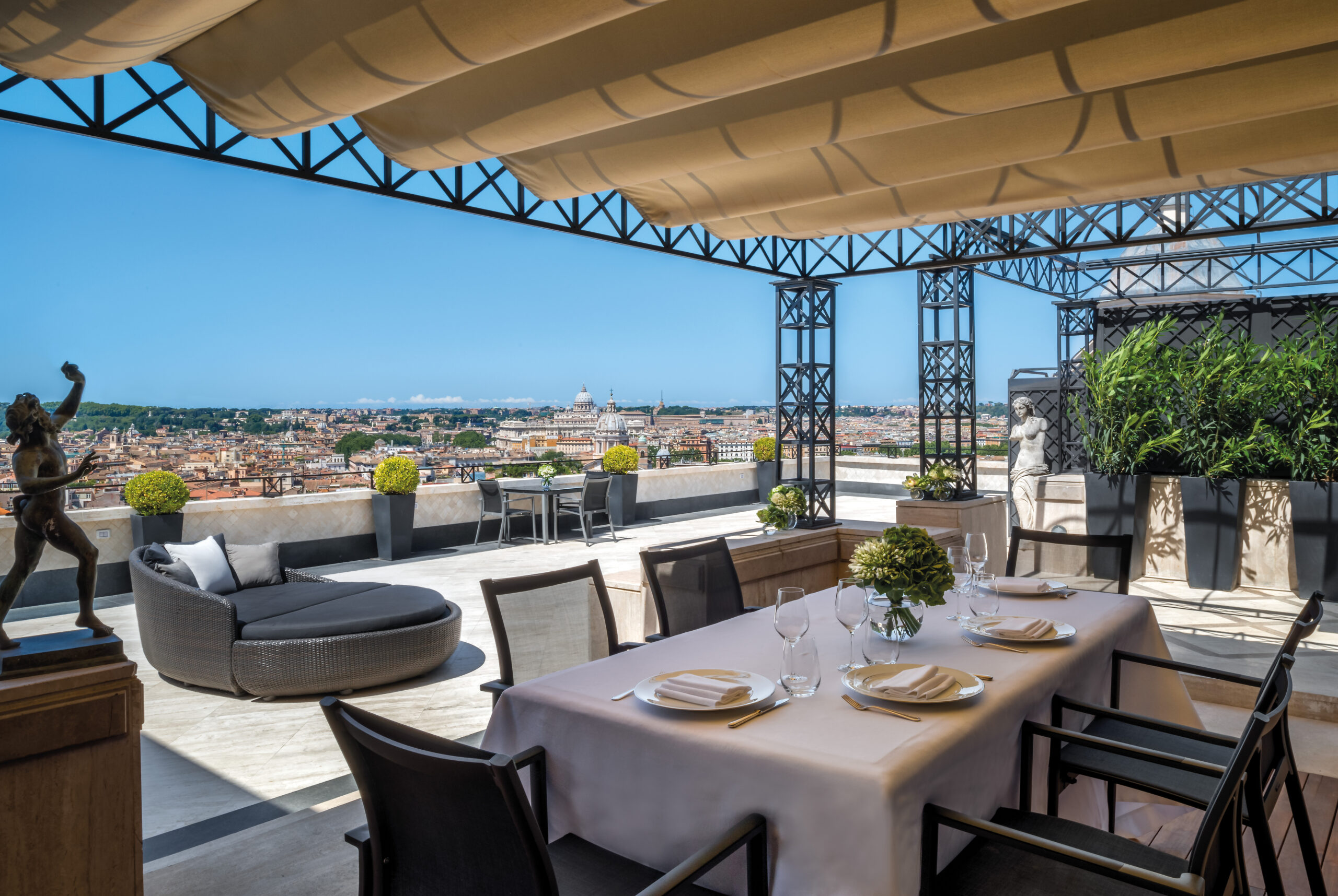 Hinter der traditionsreichen Fassade befinden sich 87 individuell gestaltete Zimmer und Suiten, die klassischen römischen Stil mit modernem Komfort verbinden. Die Presidential und Penthouse Suiten verfügen über großzügige Terrassen mit weitem Blick über die Stadt, während die Interieurs eine harmonische Mischung aus antiken Möbeln, zeitgenössischer Kunst und italienischer Handwerkskunst widerspiegeln.