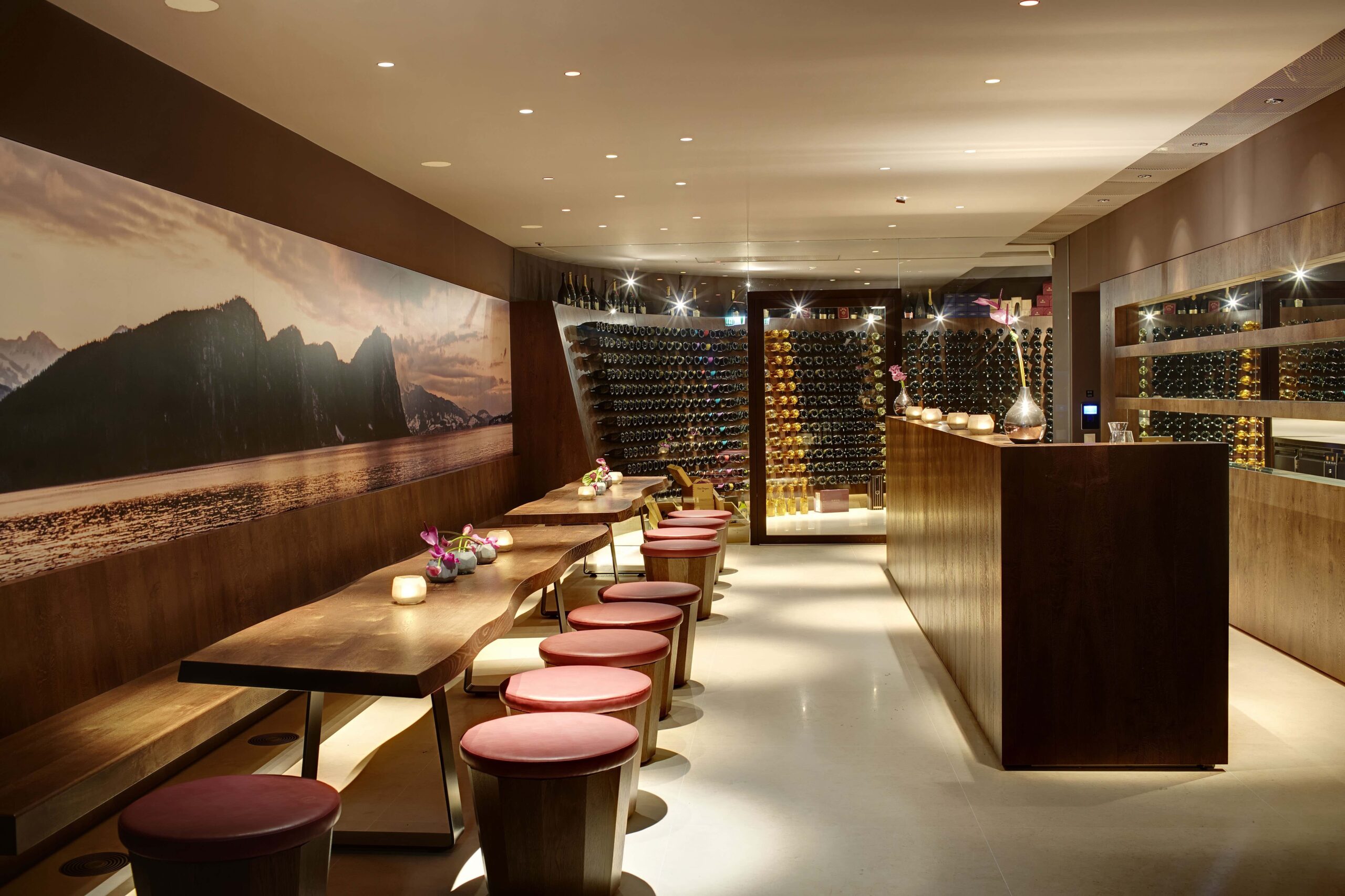 Gegenüber vom Foyer beeindruckt der Alte-Welt-Keller mit kunstvollen Regalen aus hölzernen Pentagonen. Sie sind gefüllt mit Klassikern aus Italien und Spanien, gealterten Portos und Madeiras, deutschen Rieslingen, österreichischen Spitzenweinen, aber auch mit Preziosen aus dem Libanon oder Ungarn. Beachtlich ist auch das Sortiment an Schweizer Weinen, das namhafte Winzer wie Gantenbein, Donatsch und Chanton umfasst.