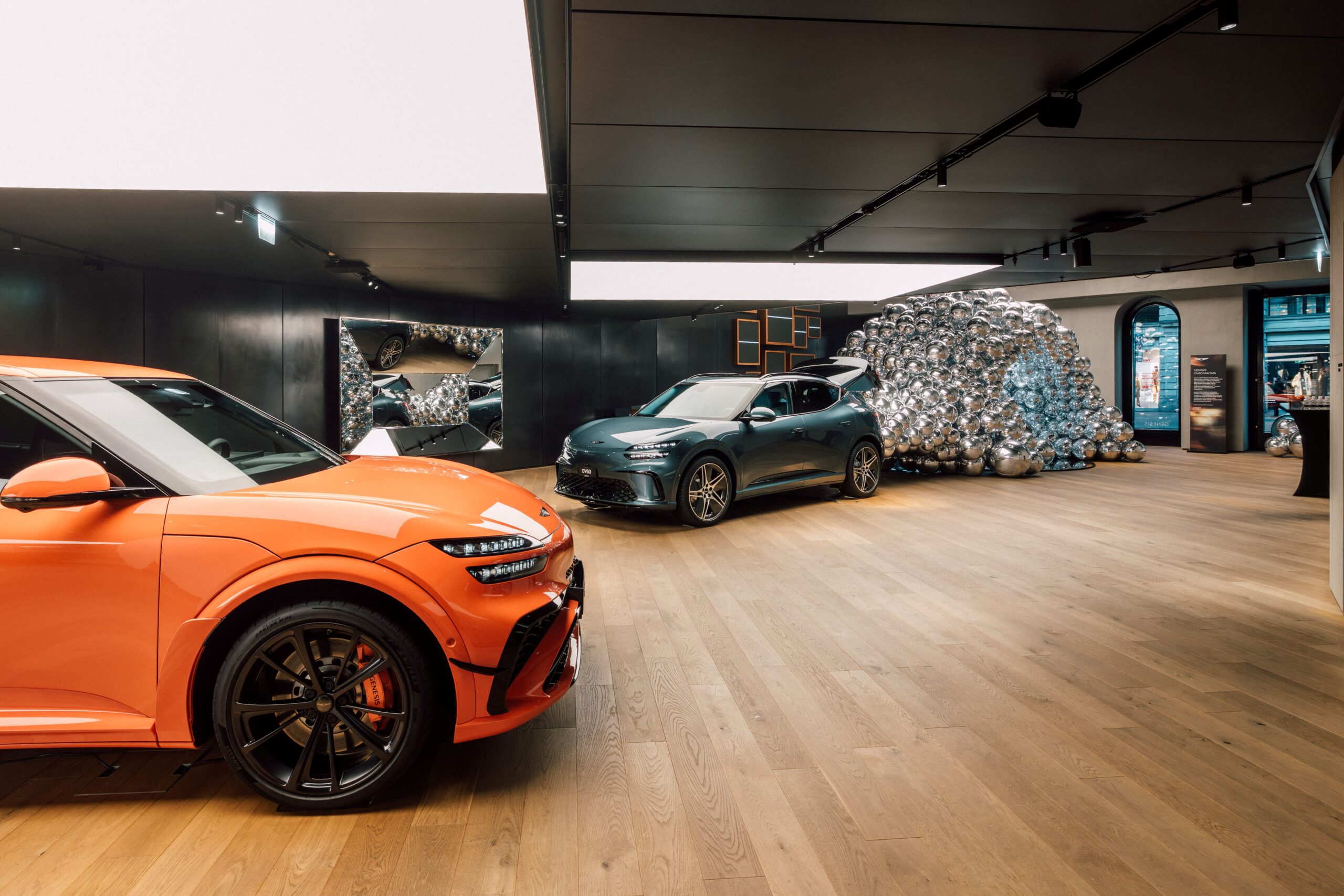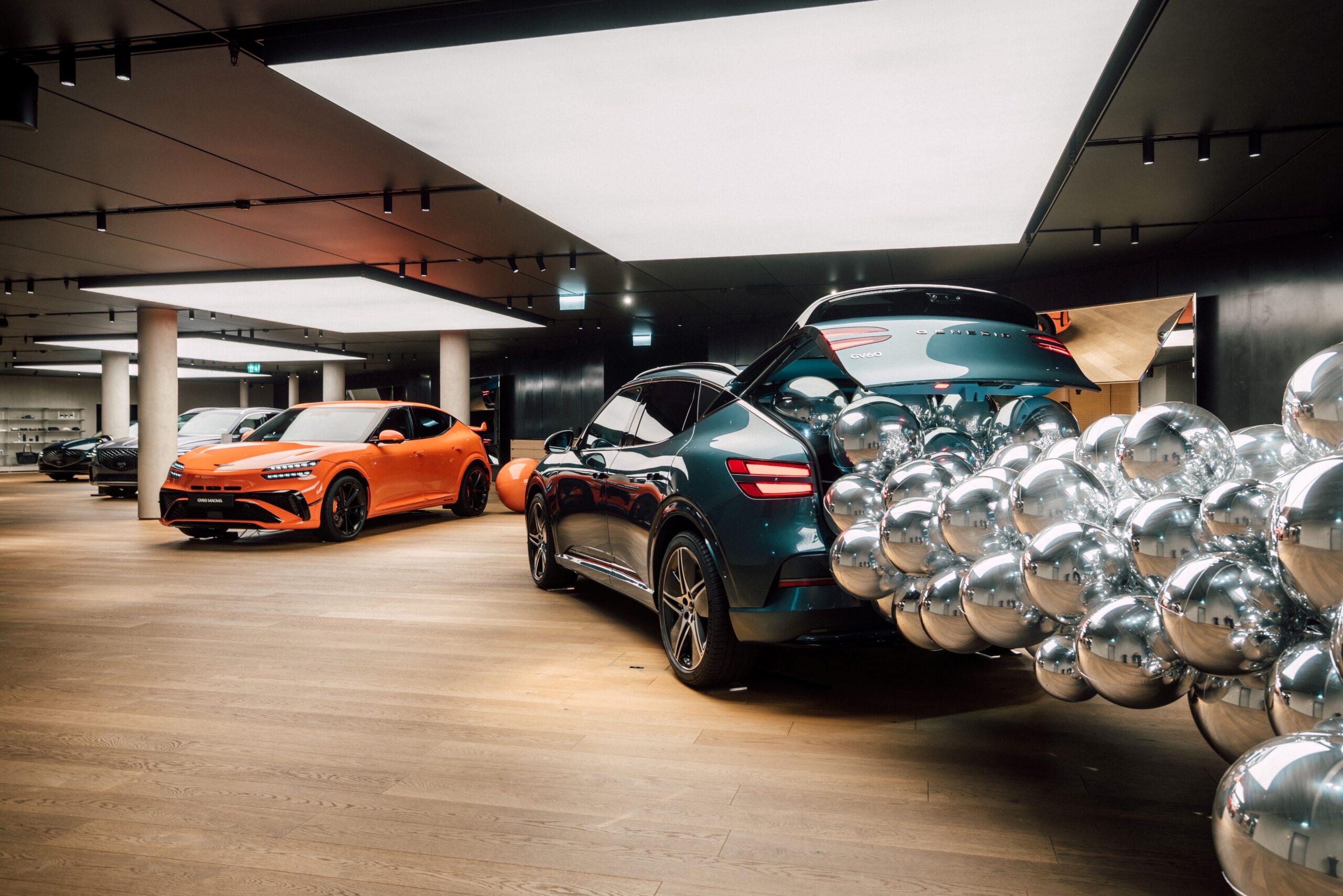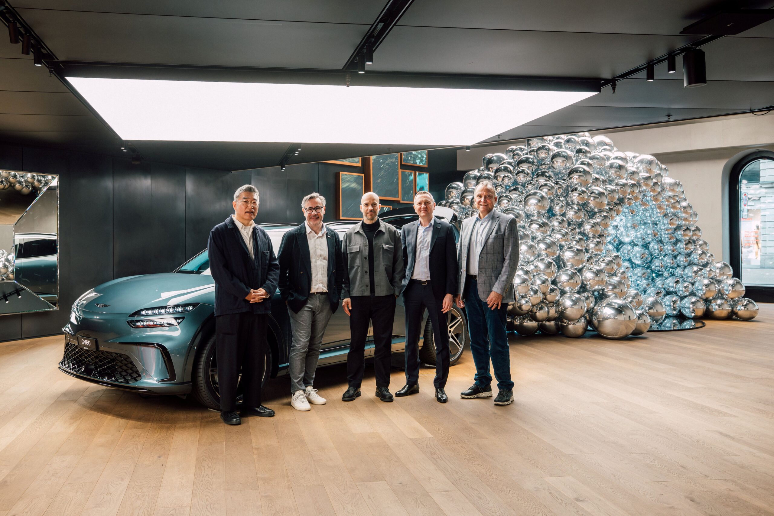 Schon beim Betreten des Studios zog eine eindrucksvolle Installation alle Blicke auf sich. Aus dem Kofferraum eines neu überarbeiteten GV60 schienen Hunderte silbern reflektierende Kugeln zu strömen. Das Licht brach sich in den Oberflächen, spiegelte Karosserie, Menschen, Architektur und machte aus dem Fahrzeug ein Objekt im Dialog mit seiner Umgebung.
