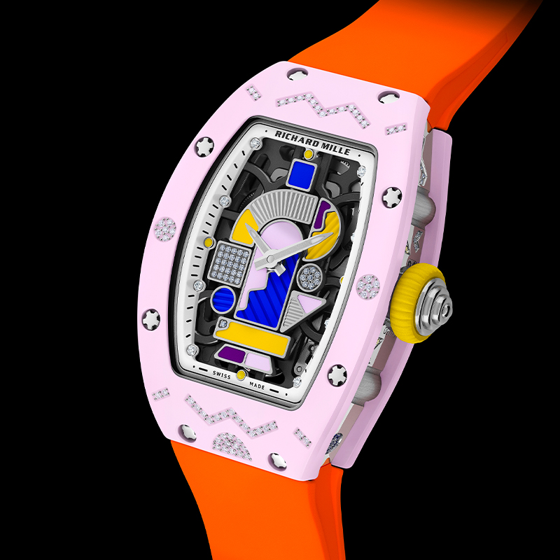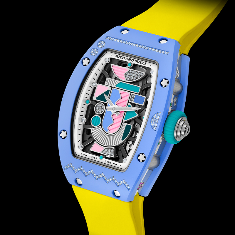 Die Inspiration schöpft aus der kreativen Energie der 1980er Jahre – einer Ära der Emanzipation, kühner Kontraste und unerwarteter Materialien. Richard Mille nimmt dieses Erbe an und kehrt es durch Zifferblätter auf, die reich an vielfältigen dekorativen Techniken sind. Wie Cécile Guenat, Kreativ- und Entwicklungsleiterin, während der Entstehung der beiden vorherigen Kollektionen feststellte: „Diese Uhren spielen mit der Gegenüberstellung lebendiger Farben und kontrastierender Texturen und betonen eine einzigartige und disruptive grafische Identität.“
