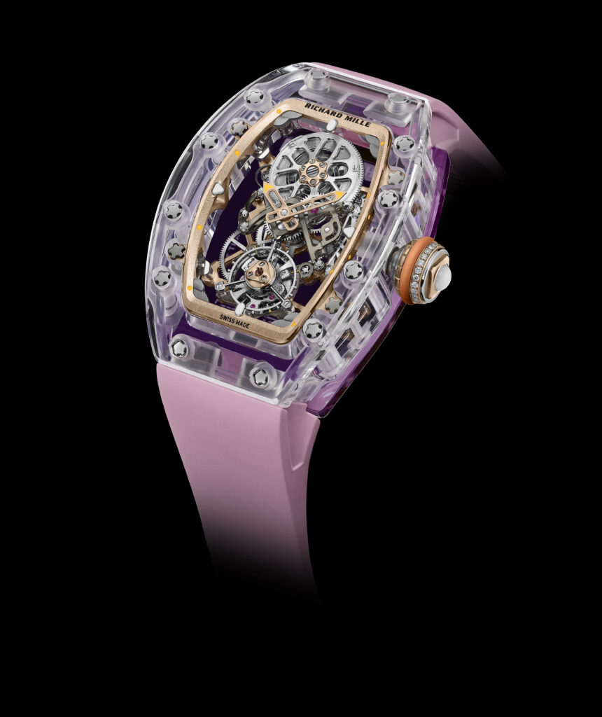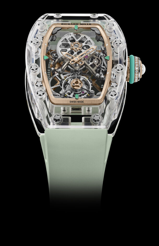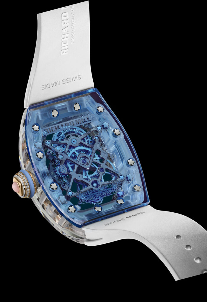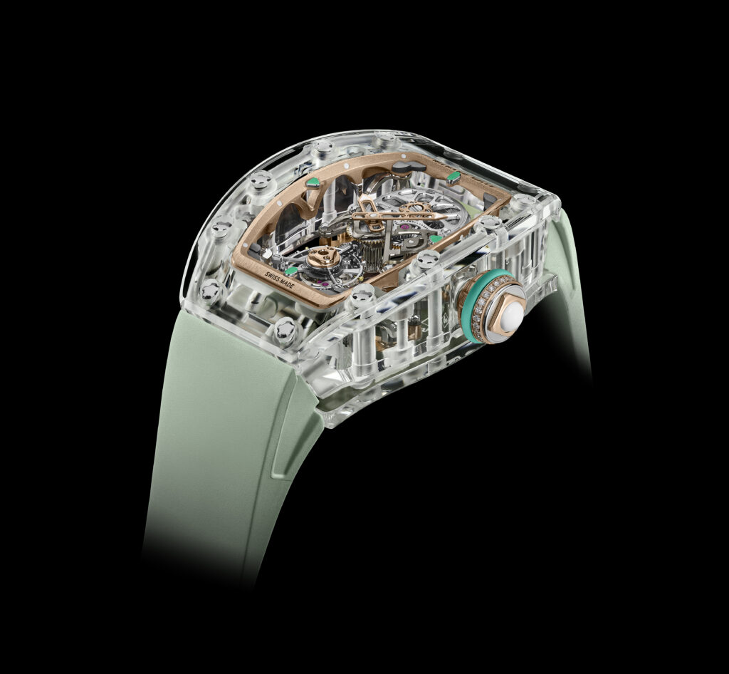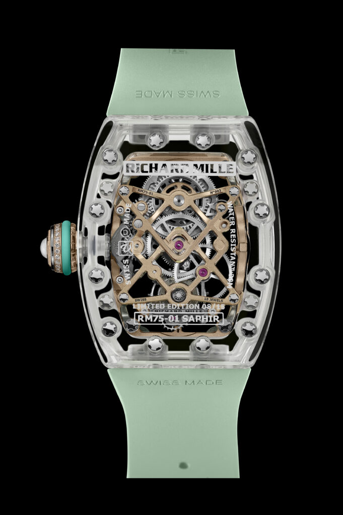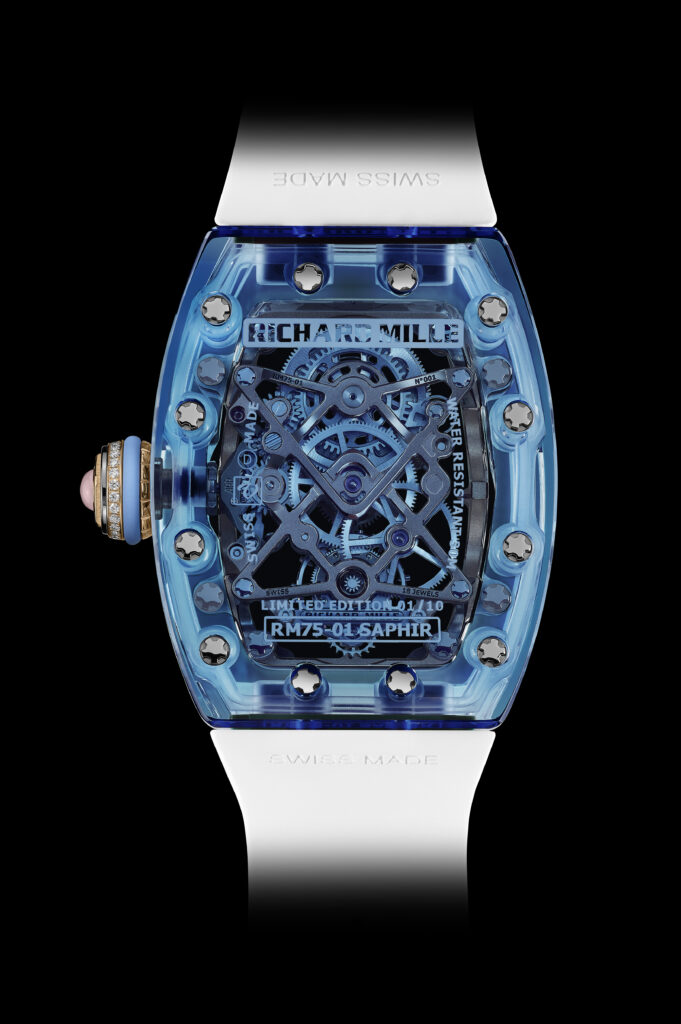 Die Transparenz von Saphir ermöglicht es, die gesamte Struktur eines Uhrwerks zu enthüllen, wie die RM 75-01 Flying Tourbillon Sapphire anschaulich vor Augen führt. Bei Richard Mille wurde das Potenzial dieses Materials für die Herstellung ganzer Uhrengehäuse erstmals voll ausgeschöpft. Die Verwendung von synthetischem Saphir ermöglichte die Herstellung aller drei Gehäuseteile: Lünette, Mittelteil und Boden.