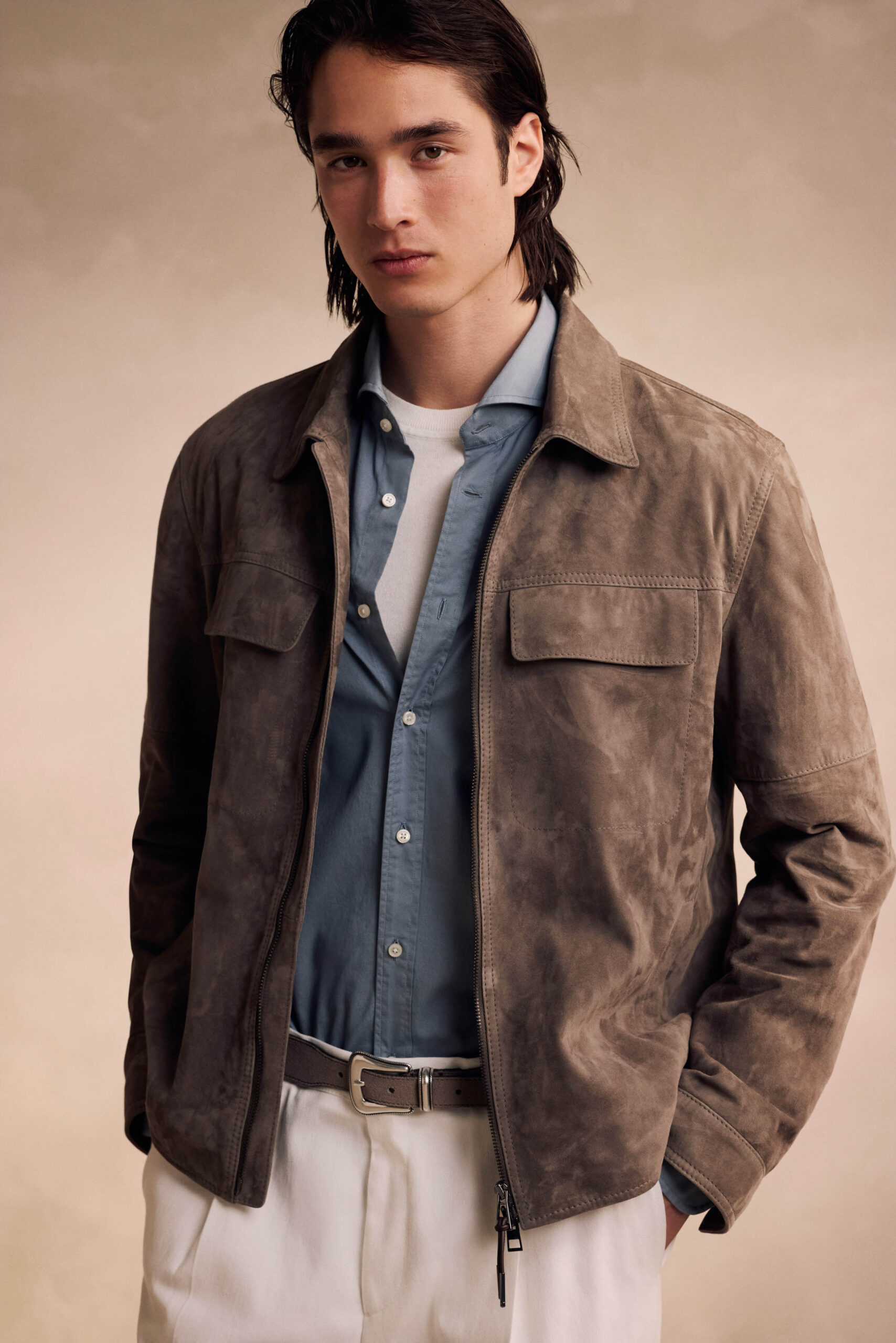Die Outerwear bringt vertraute Formen in Bewegung: wattierte Overshirts, Trenchcoats mit mehr Volumen und neue, strukturiertere Materialien. Dezente Streetwear-Anleihen schaffen dabei einen modernen Kontrast zu klassischen Elementen. Leder zeigt sich facettenreich – von Stehkragenjacken bis zu ungefütterten Hemdjacken als neue Option.