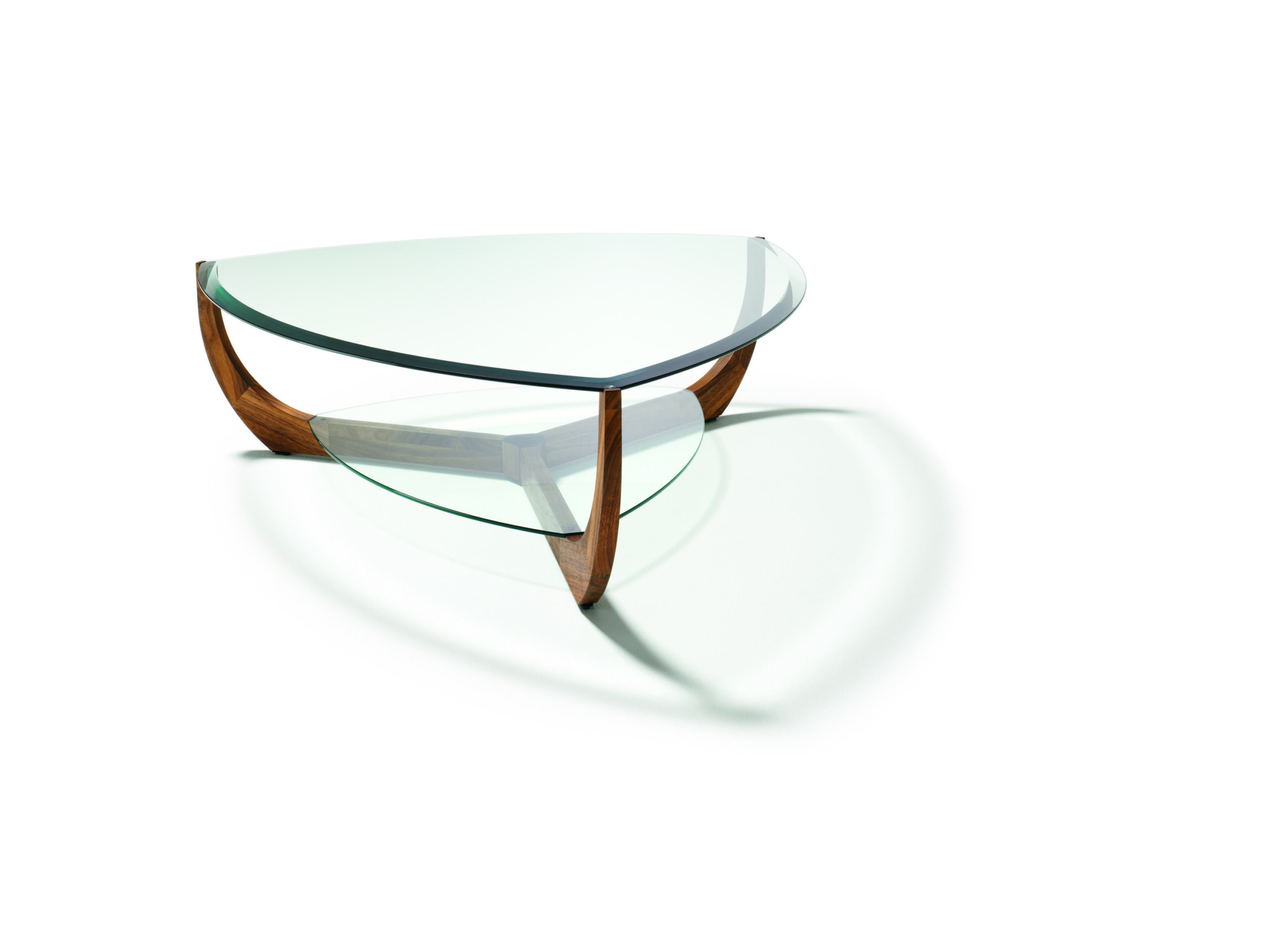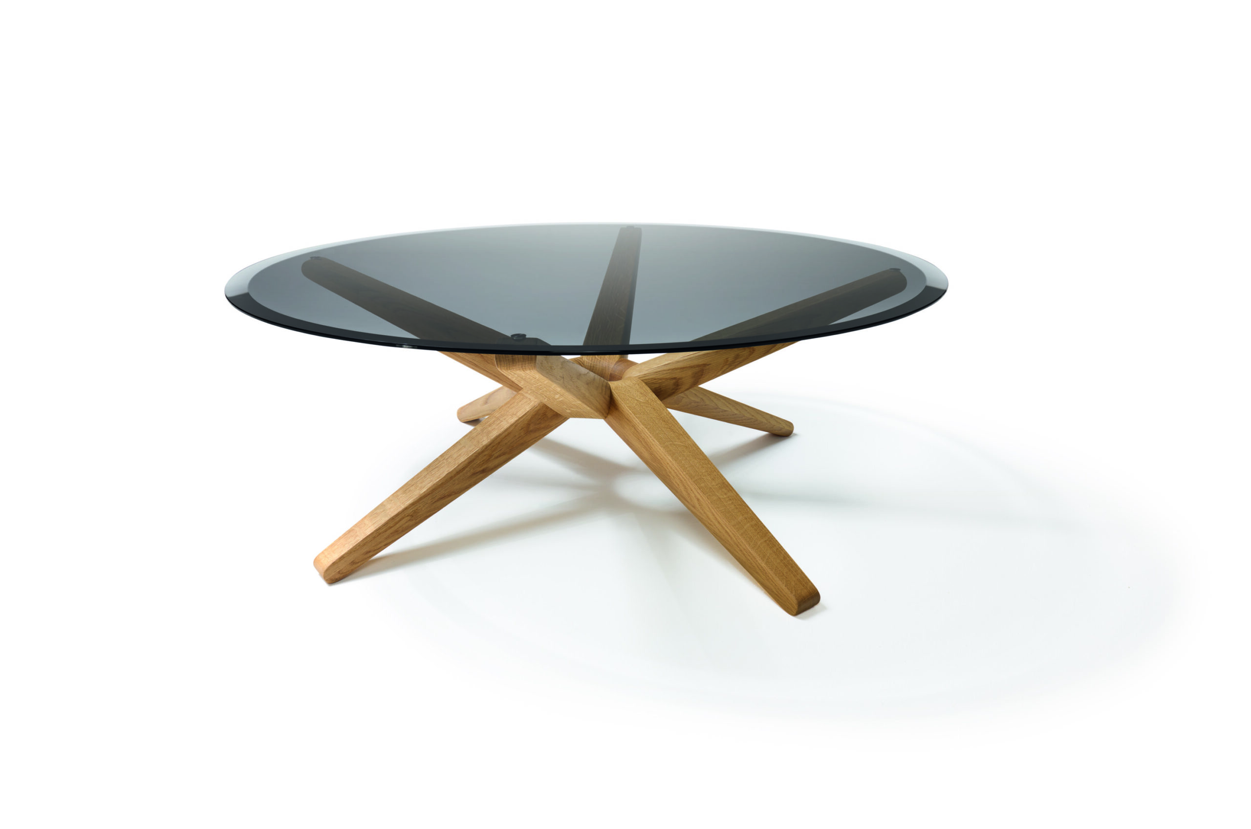 Couchtische mit Glasplatte wirken offen und transparent und lassen sich besonders gut in kleinere Räume integrieren. In Kombination mit handwerklich ausgeführten Holzgestellen entstehen charaktervolle Designobjekte. Der stern Couchtisch zeigt dies mit seinen präzise gefrästen Holzstreben, die eine runde Glasplatte tragen. Er ist sowohl mit Klarglas- als auch mit Rauchglasplatte erhältlich und setzt damit unterschiedliche Licht- und Materialstimmungen im Raum. Der juwel wiederum interpretiert das Thema fast schmuckhaft mit einer facettierten Glasplatte auf filigranem Unterbau und erinnert dabei an einen Diamantring.