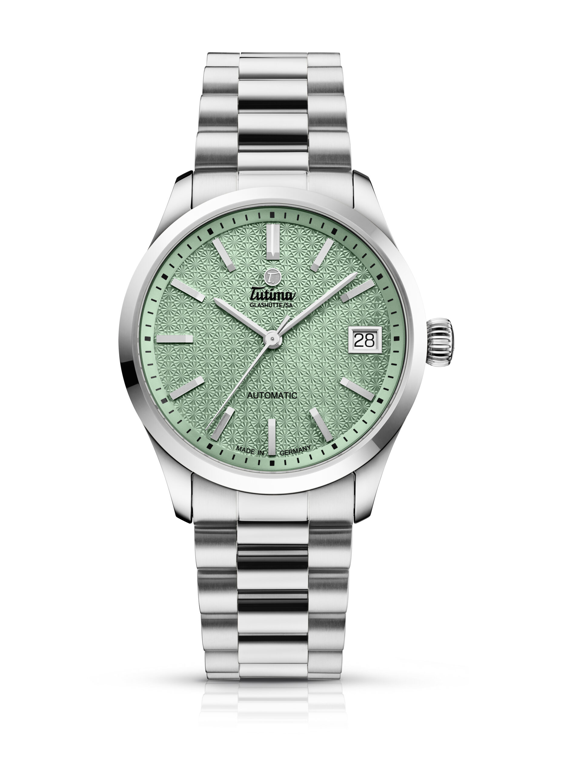 Mit der Lady Sky bringt die Traditionsmarke ein Modell mit kunstvollem Zifferblatt in Sage Green und feinem Hexagon-Relief auf den Markt – feminin, detailreich und gleichzeitig modern.