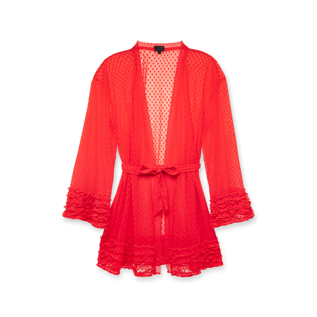 Ein Look voller Leichtigkeit: Mit ausgestellten Ärmeln, Spitze, Rüschchen und Bindegürtel schafft der Kurzkimono mit Herzchen-Look eine schöne Silhouette.